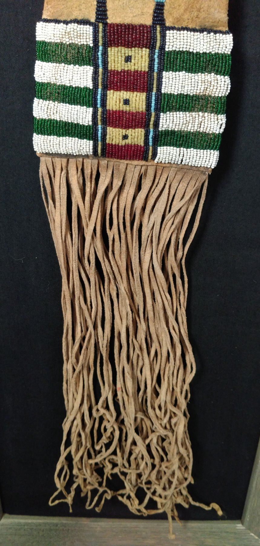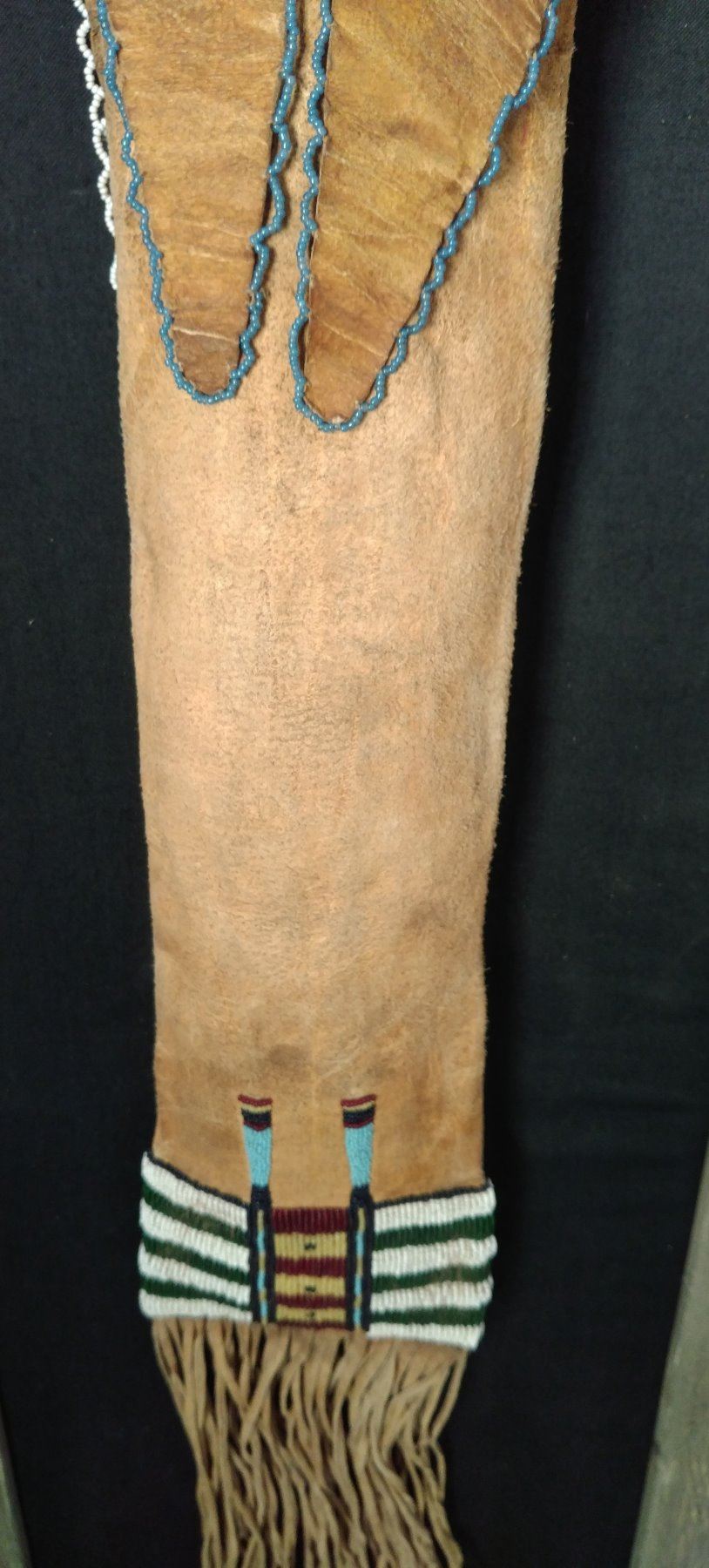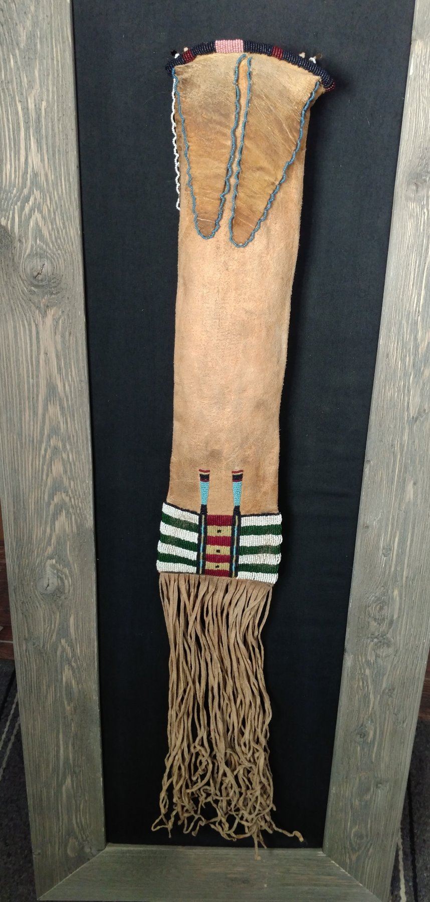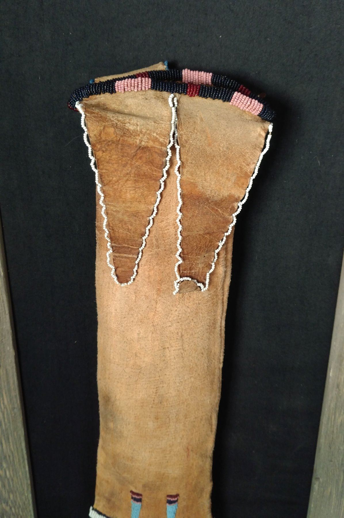 Cheyenne Pipe Bag, c. 1860s. Made of deerhide and glass beads, the item measures 4 3/4" x 31". Northern Plains. Frame not included. Condition: Good, see images. Shipping: $30.00 w/insurance and signature.
