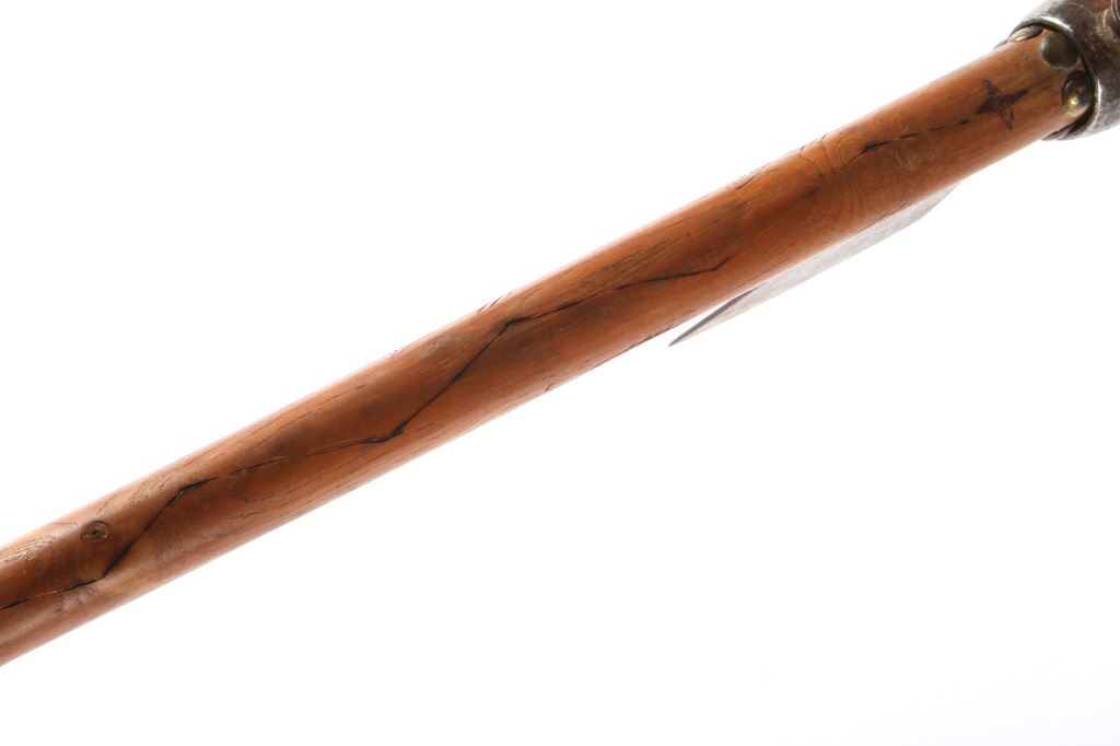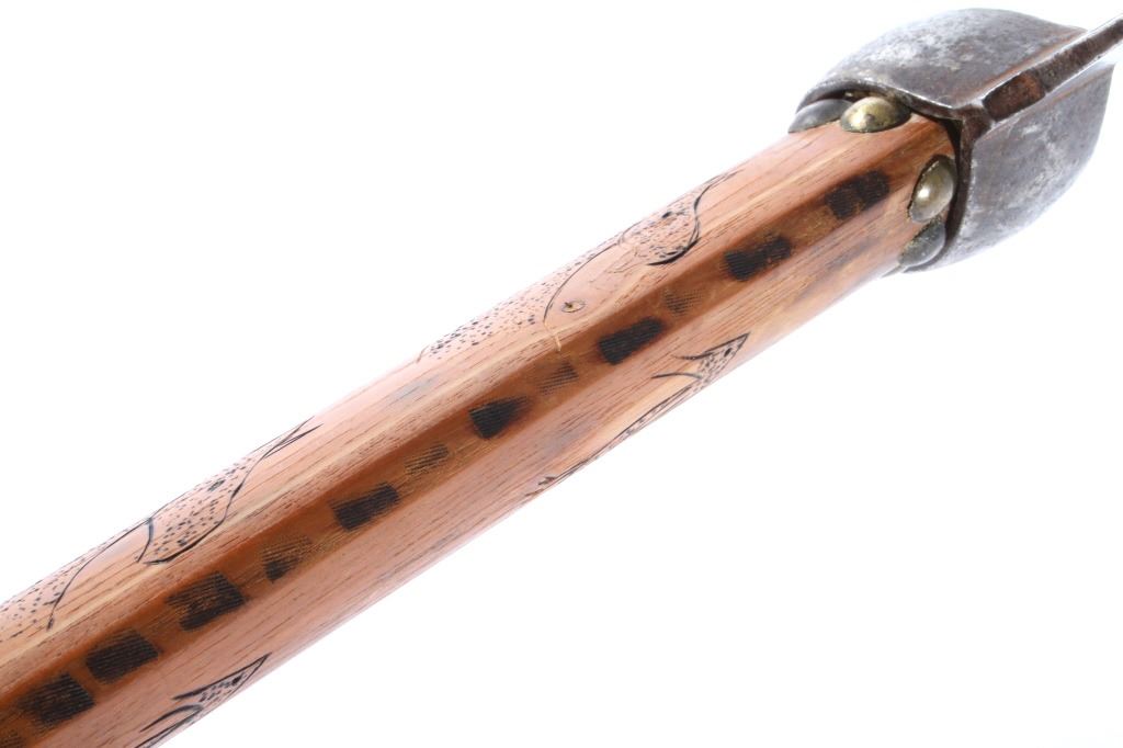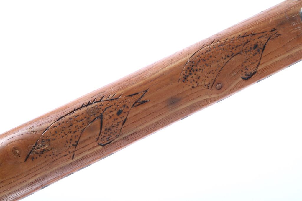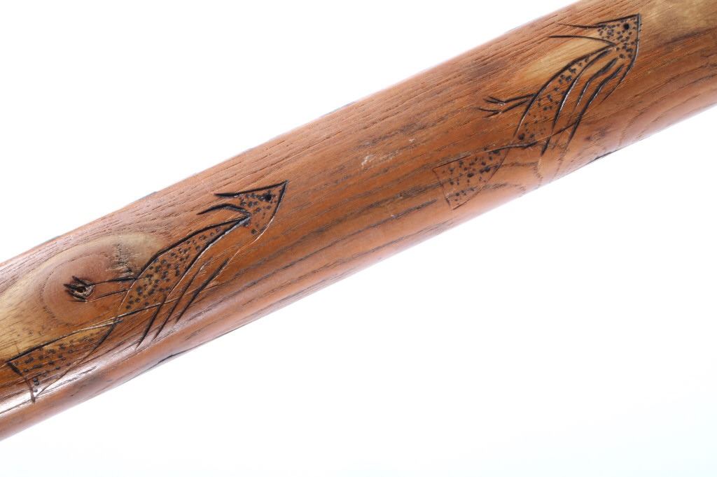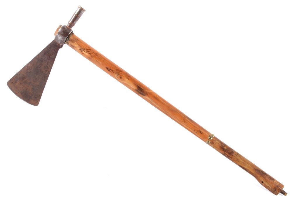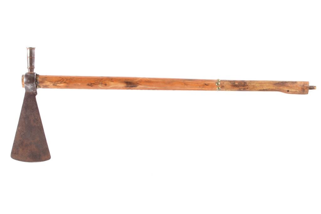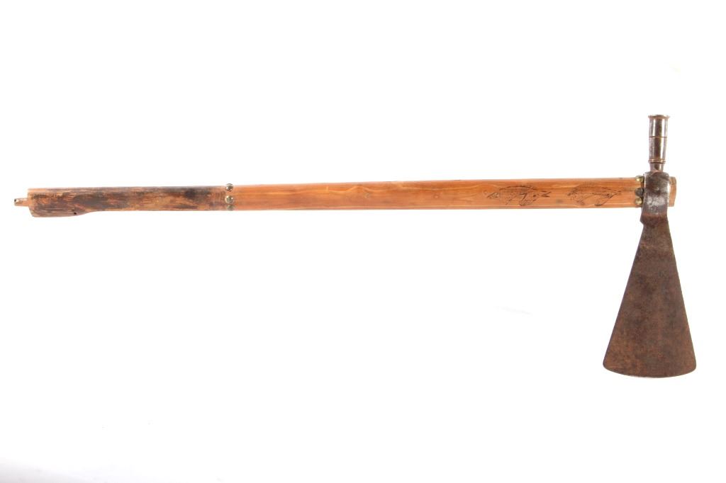 This is a Cheyenne Native American Indian Pipe Tomahawk with a rare branded or carved haft from circa 1840. The piece shows a forged iron pipe tomahawk head with a turned deep bowl and wide flat blade. The haft shows various trade brass tacks accenting with a file burn running along the under side, a shooting star effigy carving, horse effigy burn carvings on one side and bird effigy carvings along the other. Provenance: The piece is from a very large private Native American Indian artifact and weapons collection in Paris, France. The tomahawk was previously appraised for over $12,000. The piece displays very well and is very well preserved overall good museum quality condition. The Tomahawk head and haft can be separated. Measures overall 27.25"L with a 10.5"L x 3.75"W