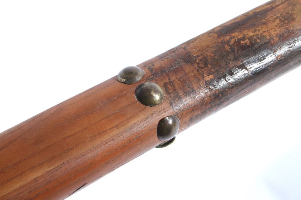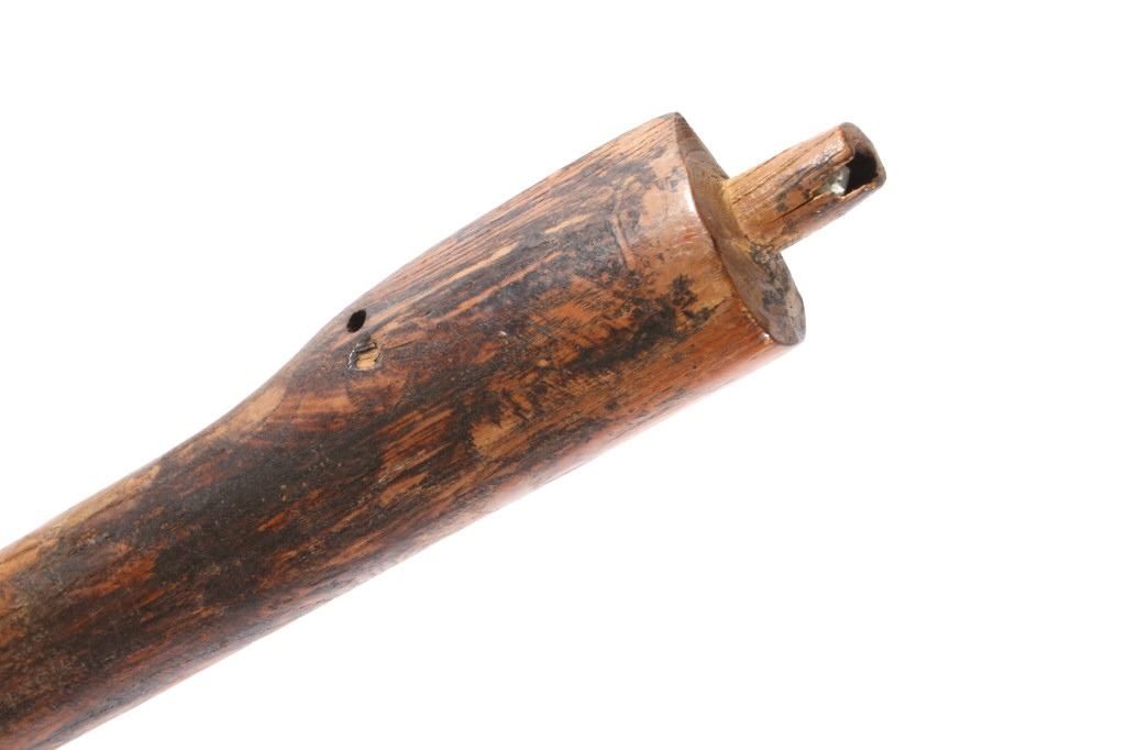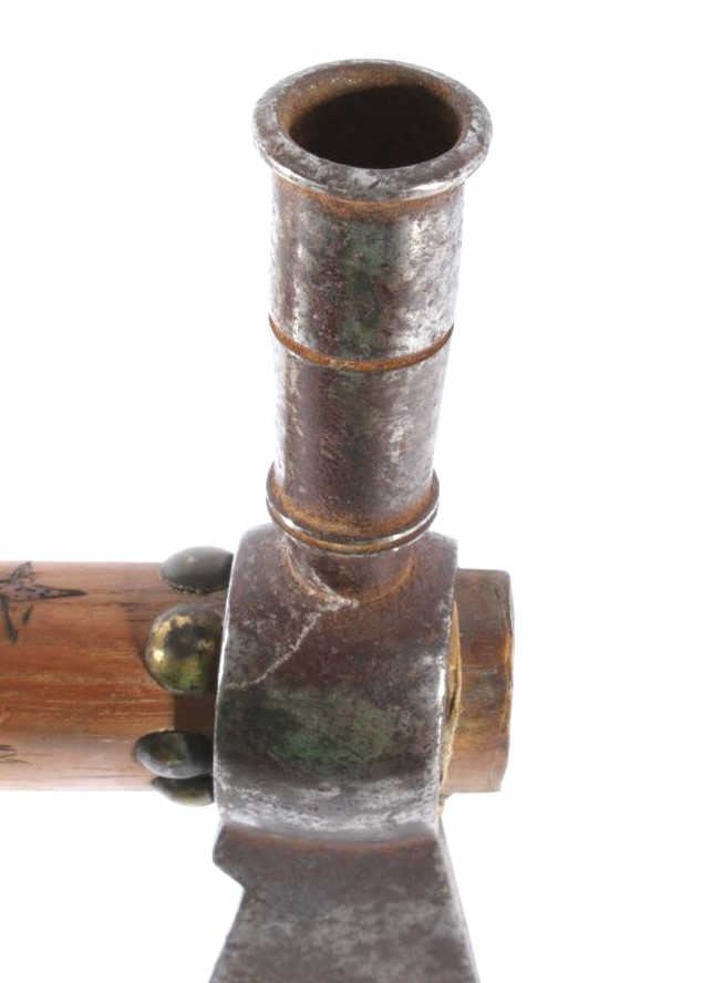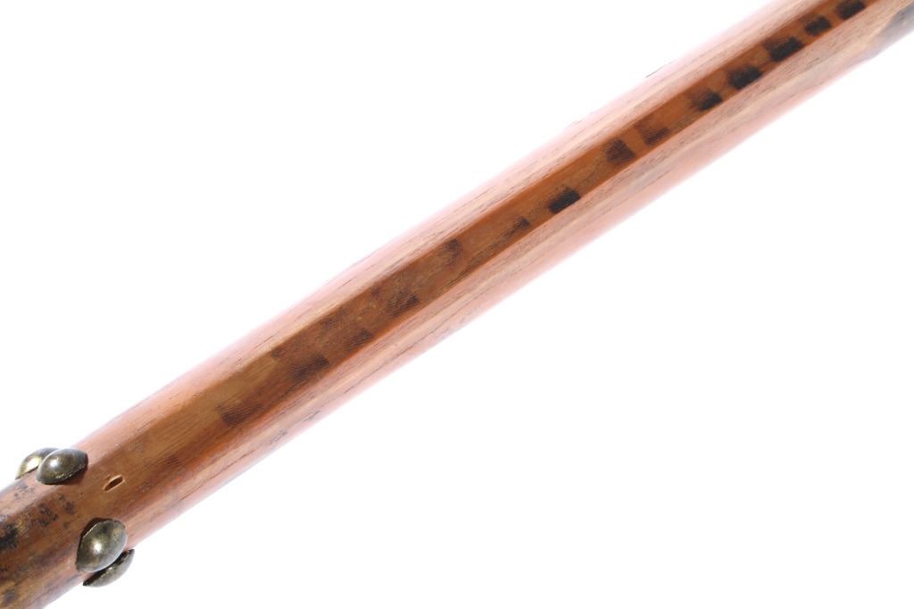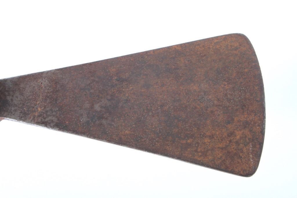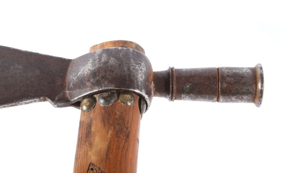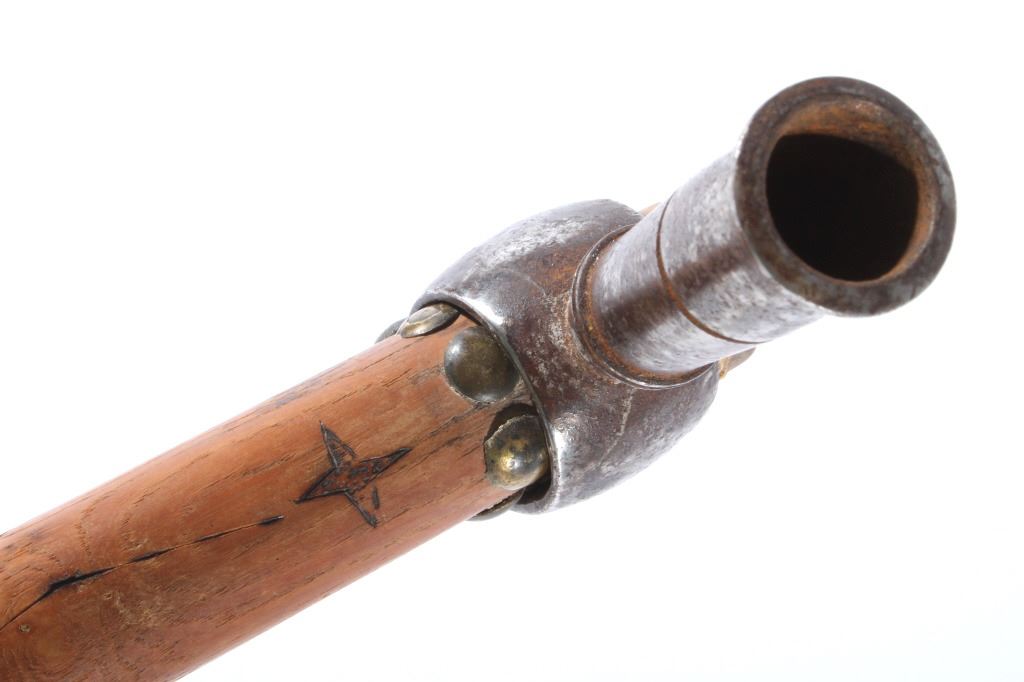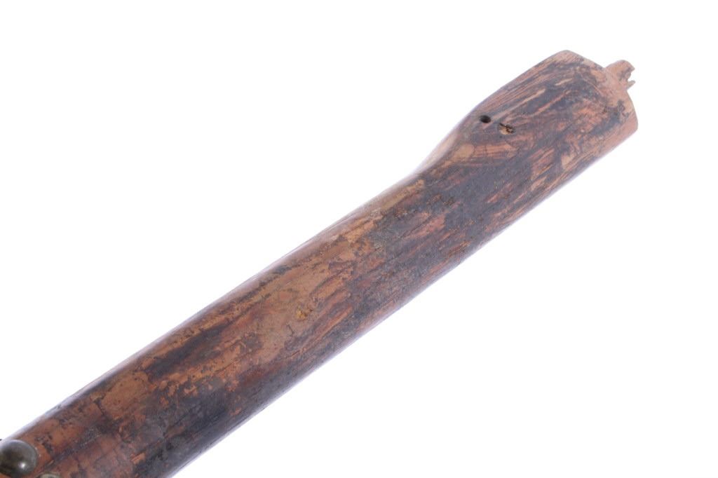 This is a Cheyenne Native American Indian Pipe Tomahawk with a rare branded or carved haft from circa 1840. The piece shows a forged iron pipe tomahawk head with a turned deep bowl and wide flat blade. The haft shows various trade brass tacks accenting with a file burn running along the under side, a shooting star effigy carving, horse effigy burn carvings on one side and bird effigy carvings along the other. Provenance: The piece is from a very large private Native American Indian artifact and weapons collection in Paris, France. The tomahawk was previously appraised for over $12,000. The piece displays very well and is very well preserved overall good museum quality condition. The Tomahawk head and haft can be separated. Measures overall 27.25"L with a 10.5"L x 3.75"W