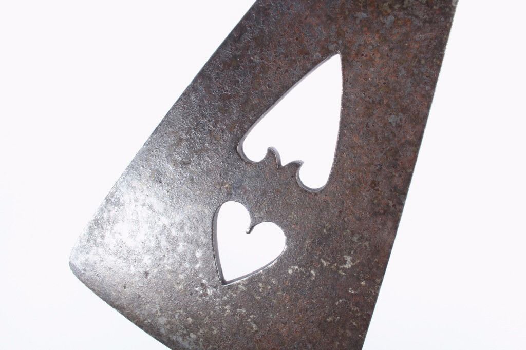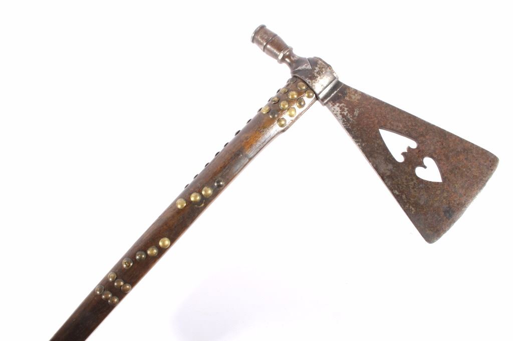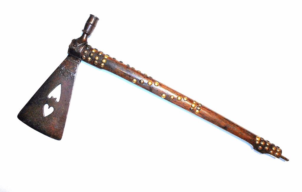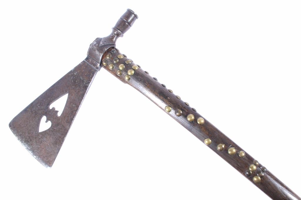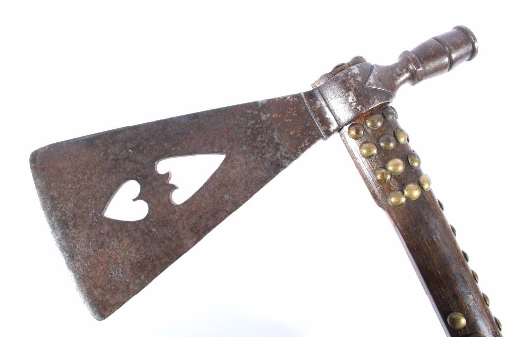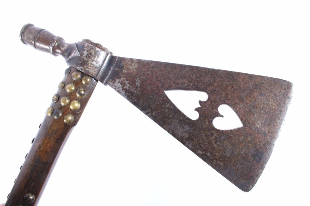 This is an exceptional circa 1880 authentic Cheyenne Native American Indian pipe tomahawk with rare double cutouts. The piece was collected by Ted Jarvis’s grandfather from the Cheyenne in Wyoming. This is a large, heavy example measuring 22 inches in length and having a 10-inch-long head. The head is hand forged from gun barrel iron with some of the rifling still visible from inside the pipe bowl. The head also features a faceted lower ring on the bowl, forged molding, small chevrons, and a wide, thin triangular-shaped blade. The blade shows the two historic and important cutouts in the center having alternating hearts. A near identical example showing the two alternating heart cutouts is documented in the book “Tomahawks & Pipe Axes of the American Frontier” by John Baldwin, page 114 figure 287. The haft shows a solid wood construction with a nice dark patina and high polish along with an excellent brass trade tack design and a high relief-carved smoking tip with teeth marks, indicating use. There are less than 25 known authentic known examples of double cutout pipe tomahawks that exist in any private or museum collection, making this an immensely rare and historic piece. From the Ex-collection of Ted and Lilly Jarvis.