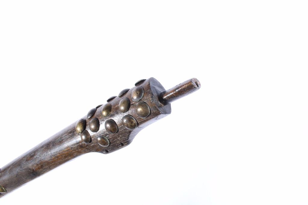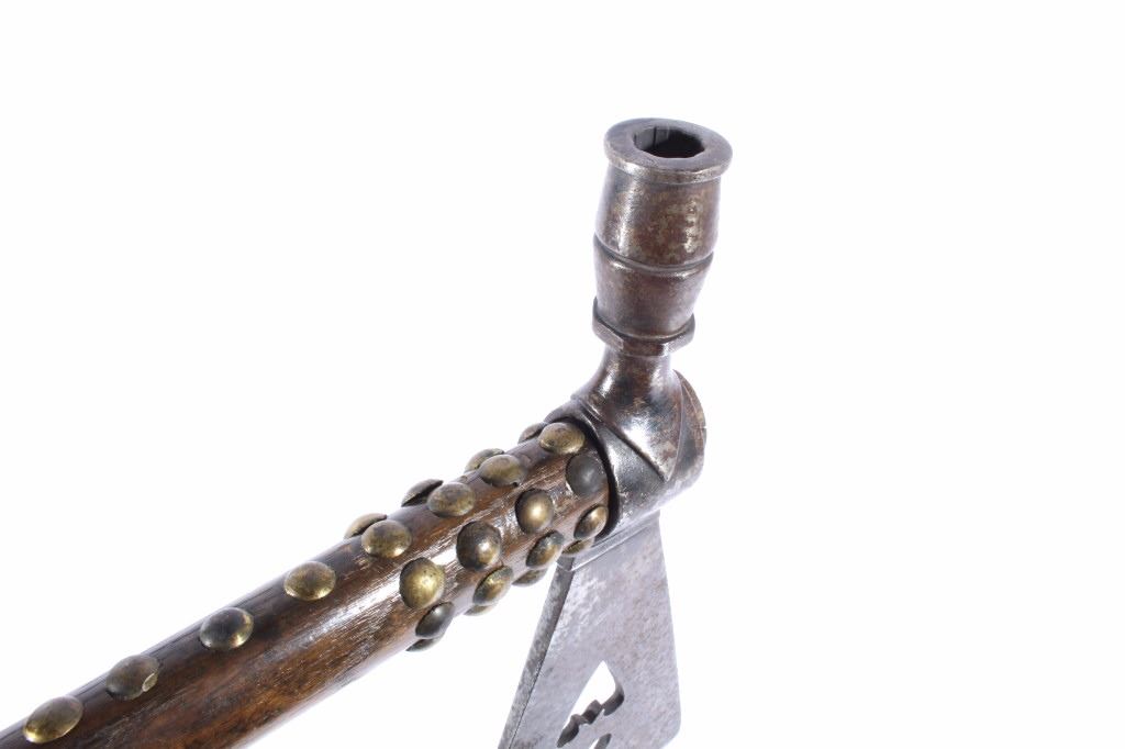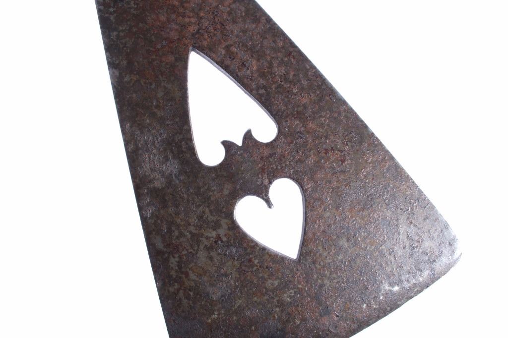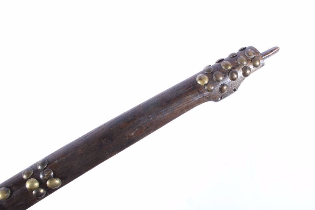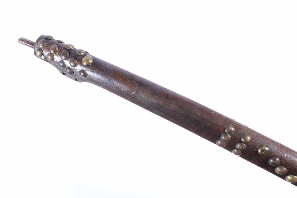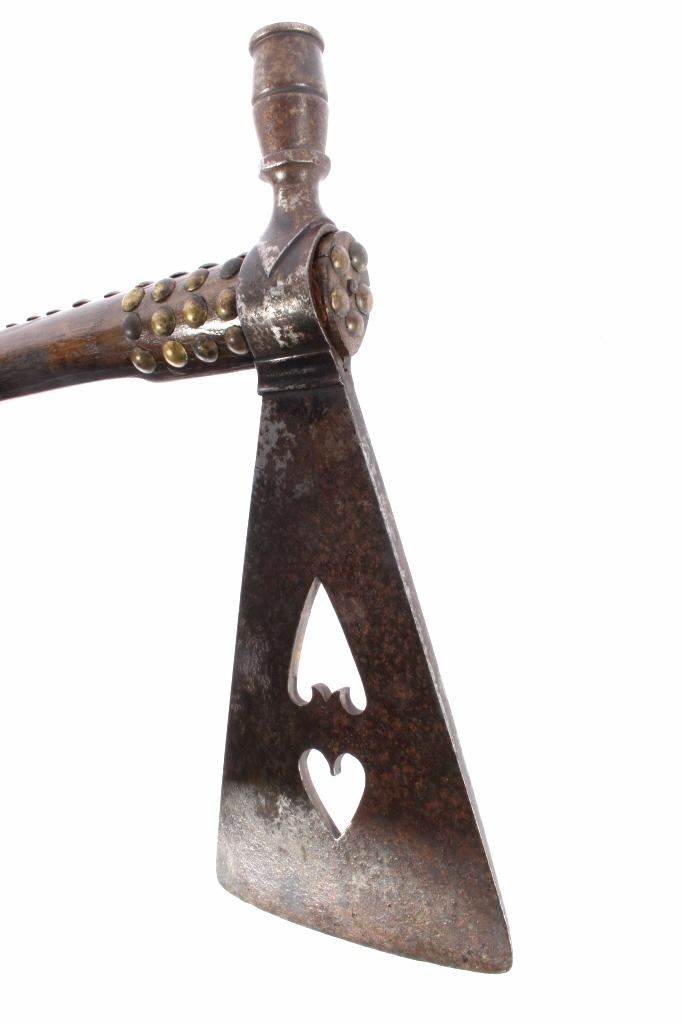 This is an exceptional circa 1880 authentic Cheyenne Native American Indian pipe tomahawk with rare double cutouts. The piece was collected by Ted Jarvis’s grandfather from the Cheyenne in Wyoming. This is a large, heavy example measuring 22 inches in length and having a 10-inch-long head. The head is hand forged from gun barrel iron with some of the rifling still visible from inside the pipe bowl. The head also features a faceted lower ring on the bowl, forged molding, small chevrons, and a wide, thin triangular-shaped blade. The blade shows the two historic and important cutouts in the center having alternating hearts. A near identical example showing the two alternating heart cutouts is documented in the book “Tomahawks & Pipe Axes of the American Frontier” by John Baldwin, page 114 figure 287. The haft shows a solid wood construction with a nice dark patina and high polish along with an excellent brass trade tack design and a high relief-carved smoking tip with teeth marks, indicating use. There are less than 25 known authentic known examples of double cutout pipe tomahawks that exist in any private or museum collection, making this an immensely rare and historic piece. From the Ex-collection of Ted and Lilly Jarvis.