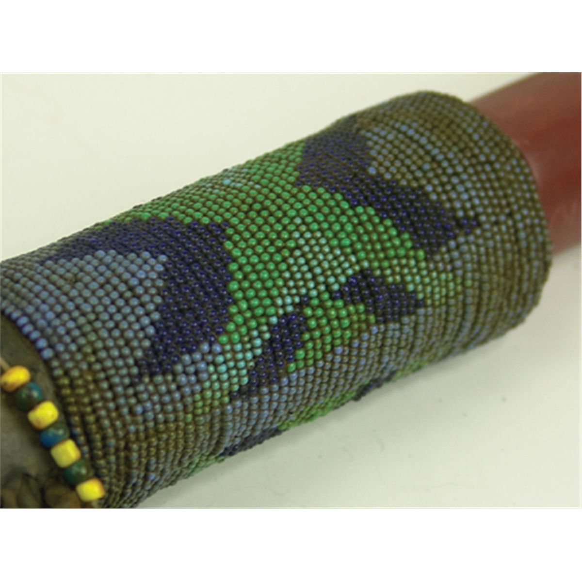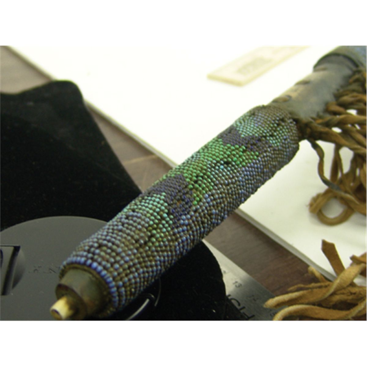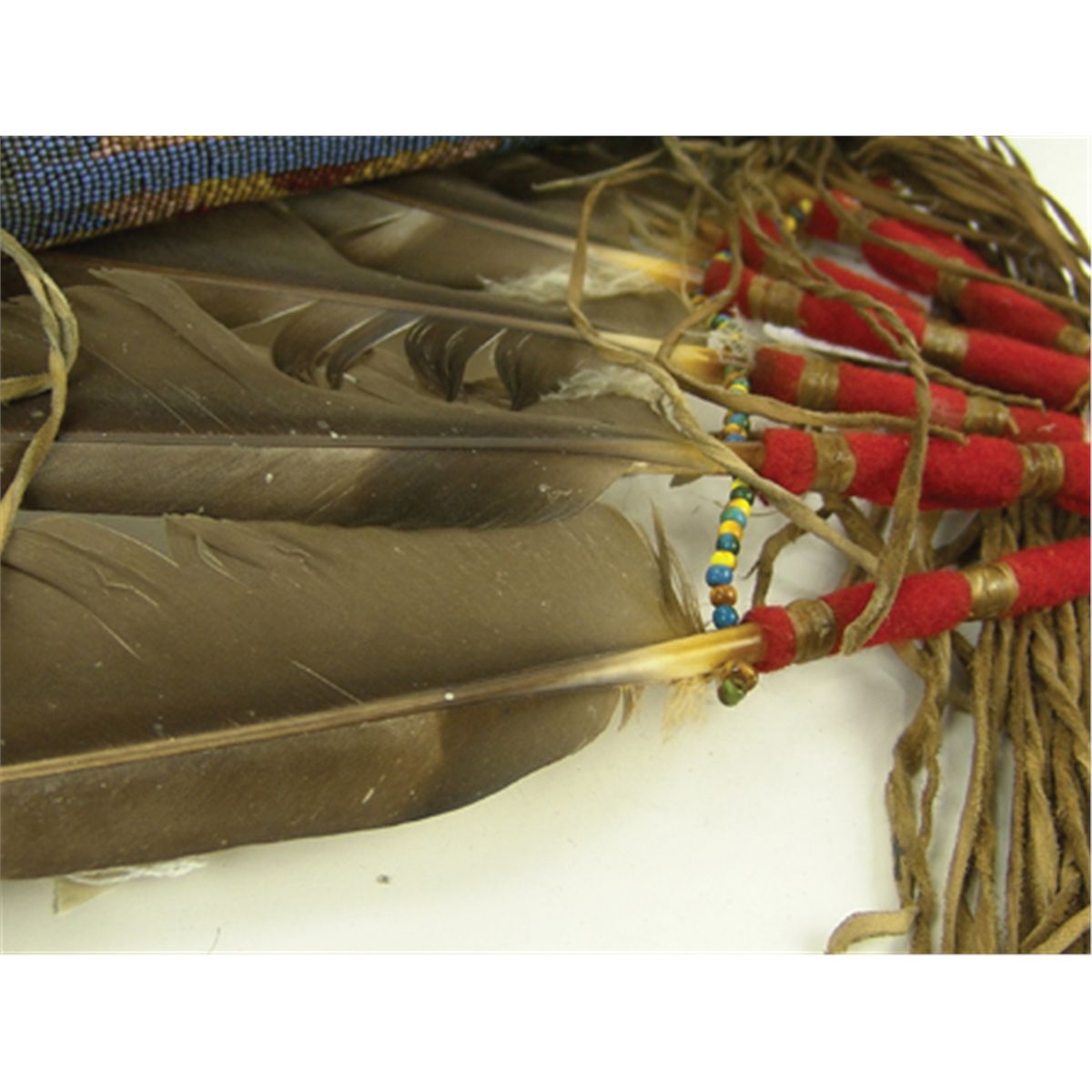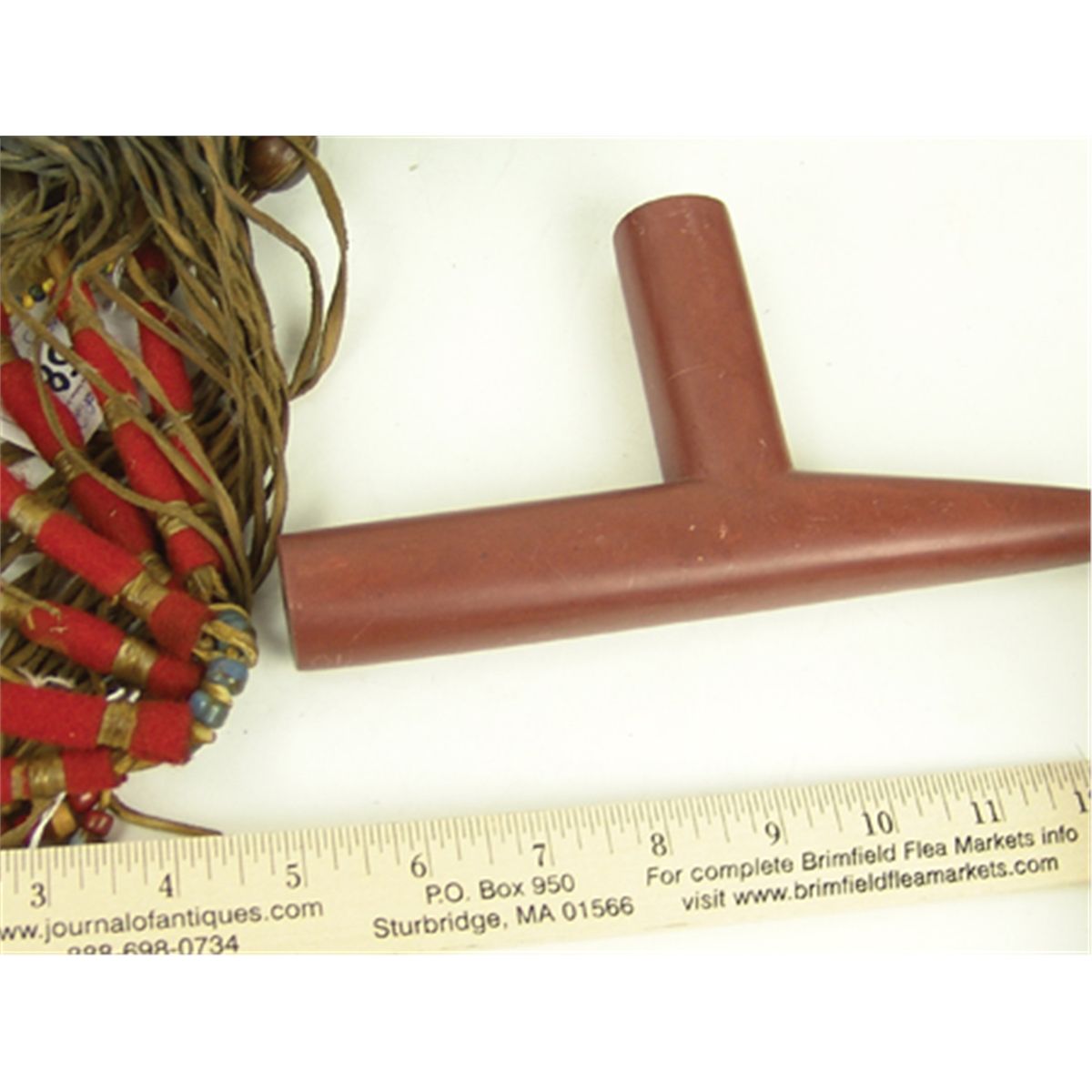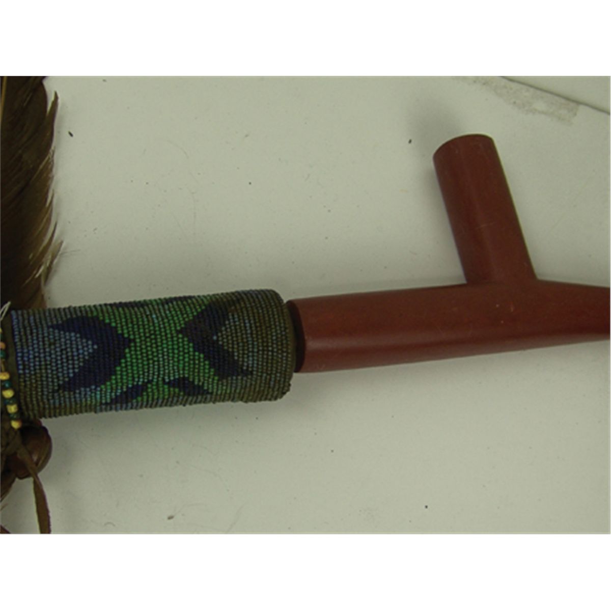 Late 1900s, Outstanding carved red catlinite "T-bowl" pipe head with long beaded and buckskin wrapped stem, brass tack adornments, and large feather drops as used in council ceremony. Very good condition. 30" stem, pipe 4" x 7-1/2"