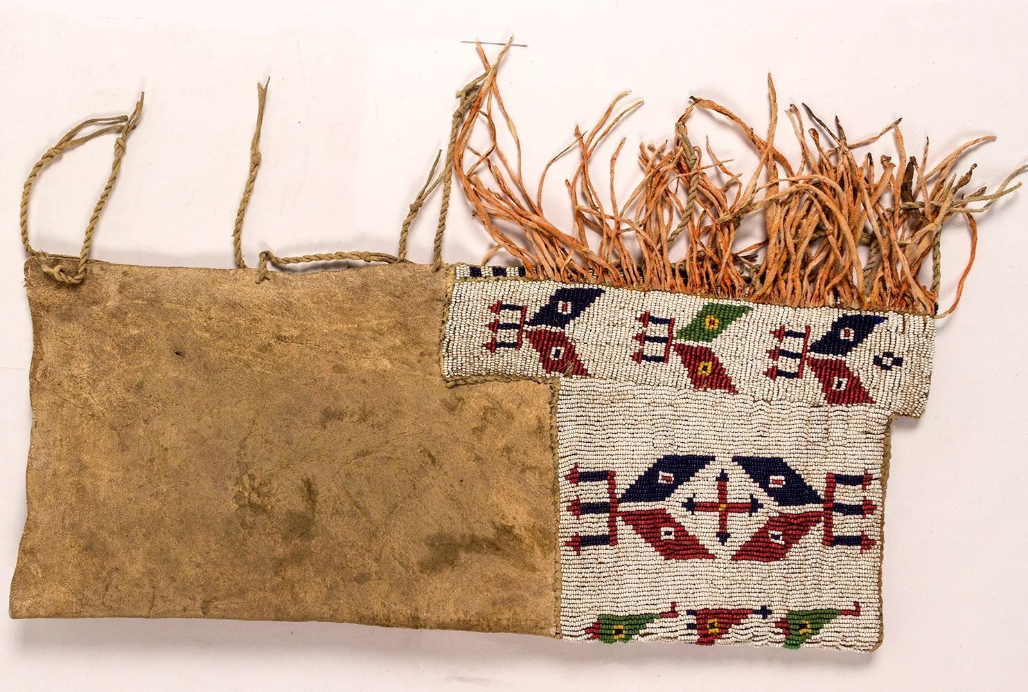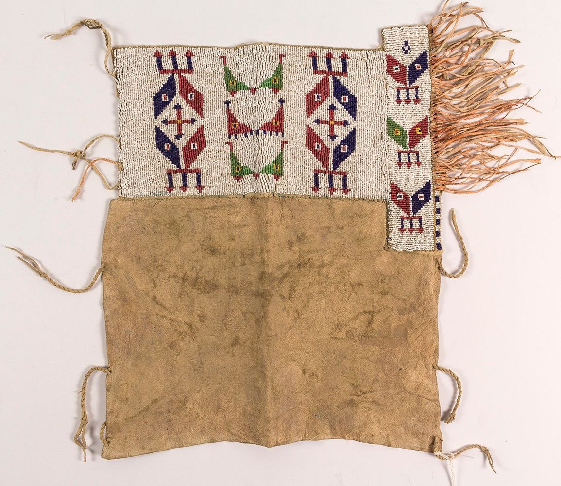 Two beaded pieces from Cheyenne leggings; c. last quarter 19th century, with red, blue, green, yellow geometric designs on a white background. One is 16" x 13" piece, excluding fringe. The other is 15" x 6" Date: Location: Northern Plains HWAC # 50756 & 50713