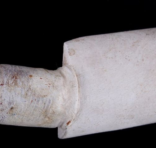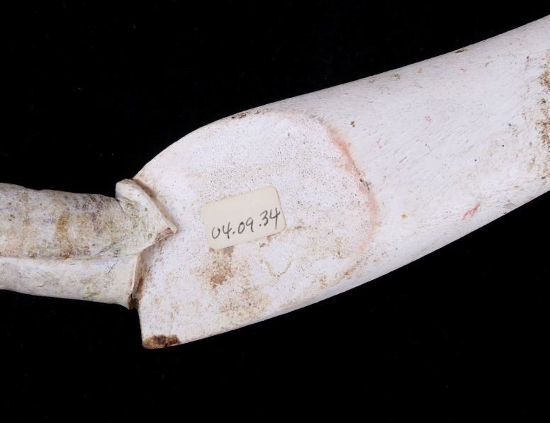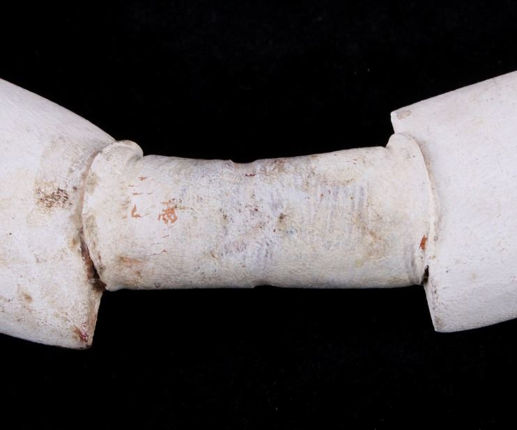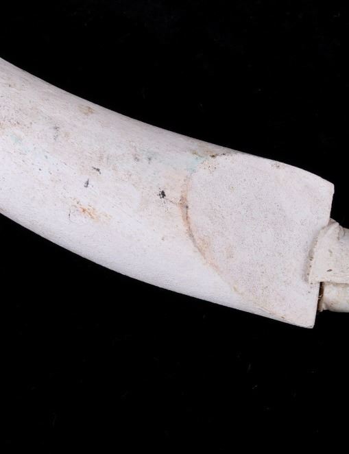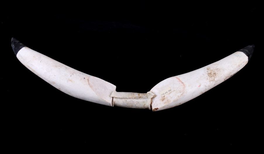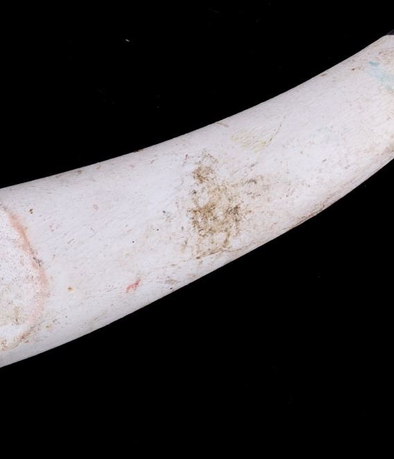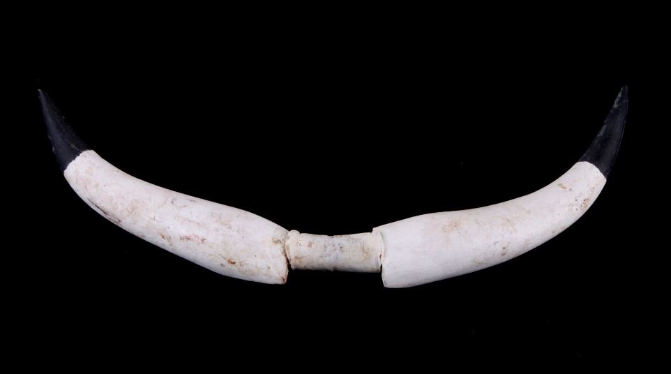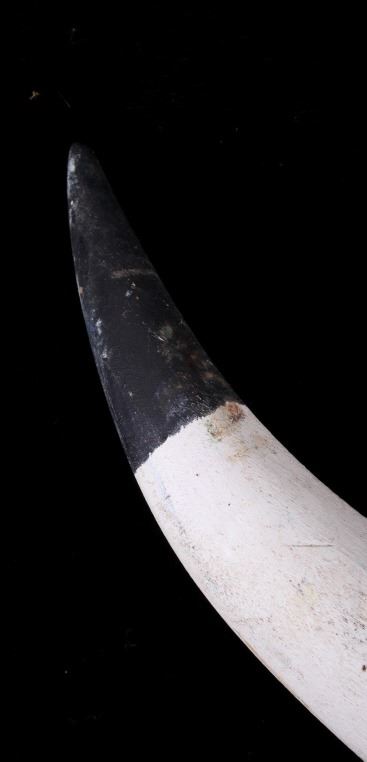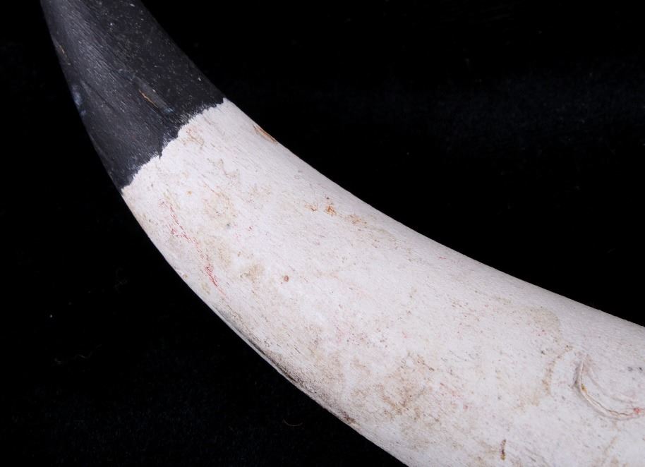 Featured in this lot is a Cheyenne Polychrome Ceremonial Painted Dance Wand. The wand is shaped like bull or buffalo horns and painted ivory with black tips. Today, the Cheyenne people are split into two federally recognized Nations: the Southern Cheyenne, who are enrolled in the Cheyenne and Arapaho Tribes in Oklahoma, and the Northern Cheyenne, who are enrolled in the Northern Cheyenne Tribe of the Northern Cheyenne Indian Reservation in Montana (wikipedia). This ceremonial wand is in good condition for age and measures 14" long.
