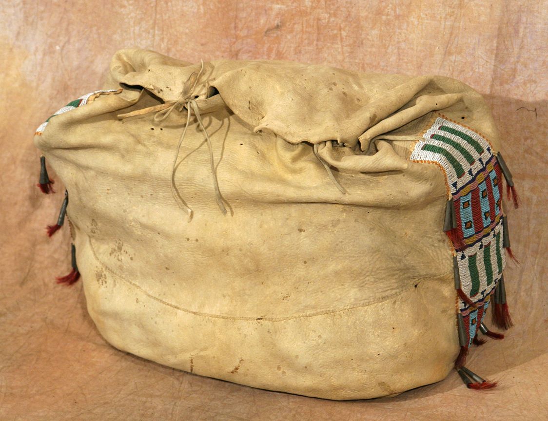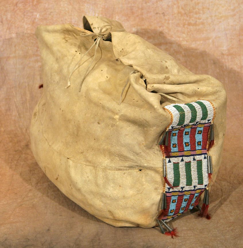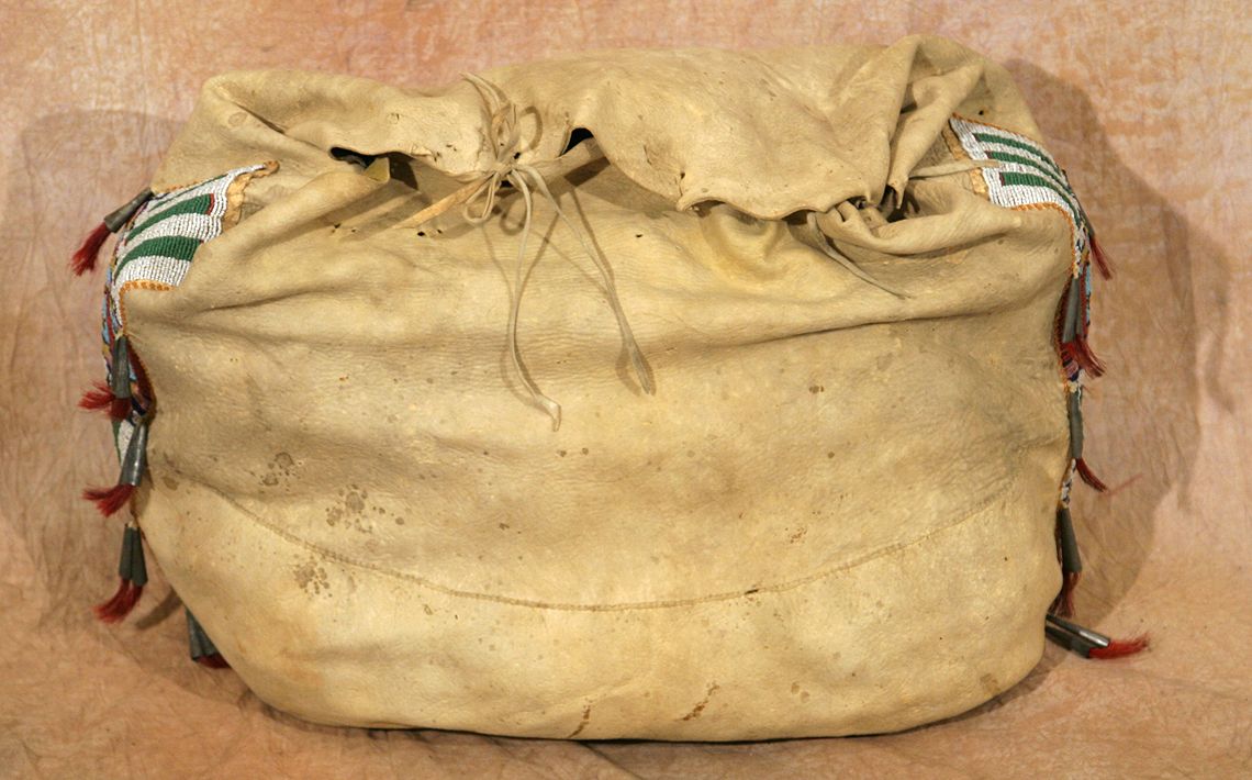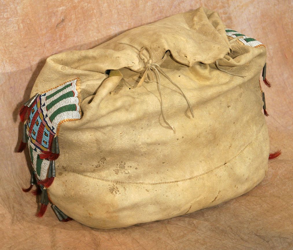 Cheyenne Possible Bag. 17" x 21" with great beaded side strips, decorated with horsehair stuffed tin cones, on fine Indian tanned buckskin. Upper front of the bag is made from an early pictorial warshirt. Circa 1870-1880. (est. $3,000-4,000). CONDITION REPORTS: www.auctioninsantafe.com/docs/cr2012.pdf