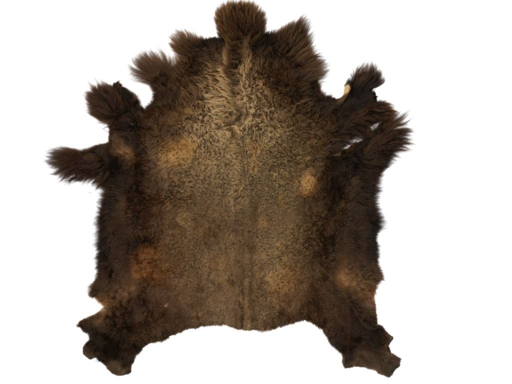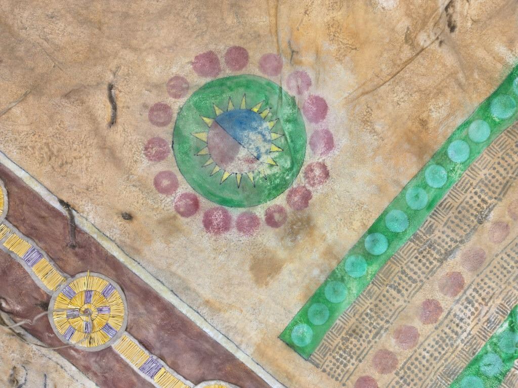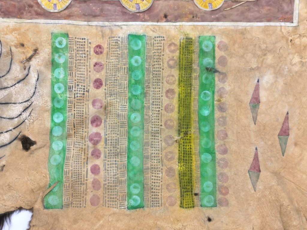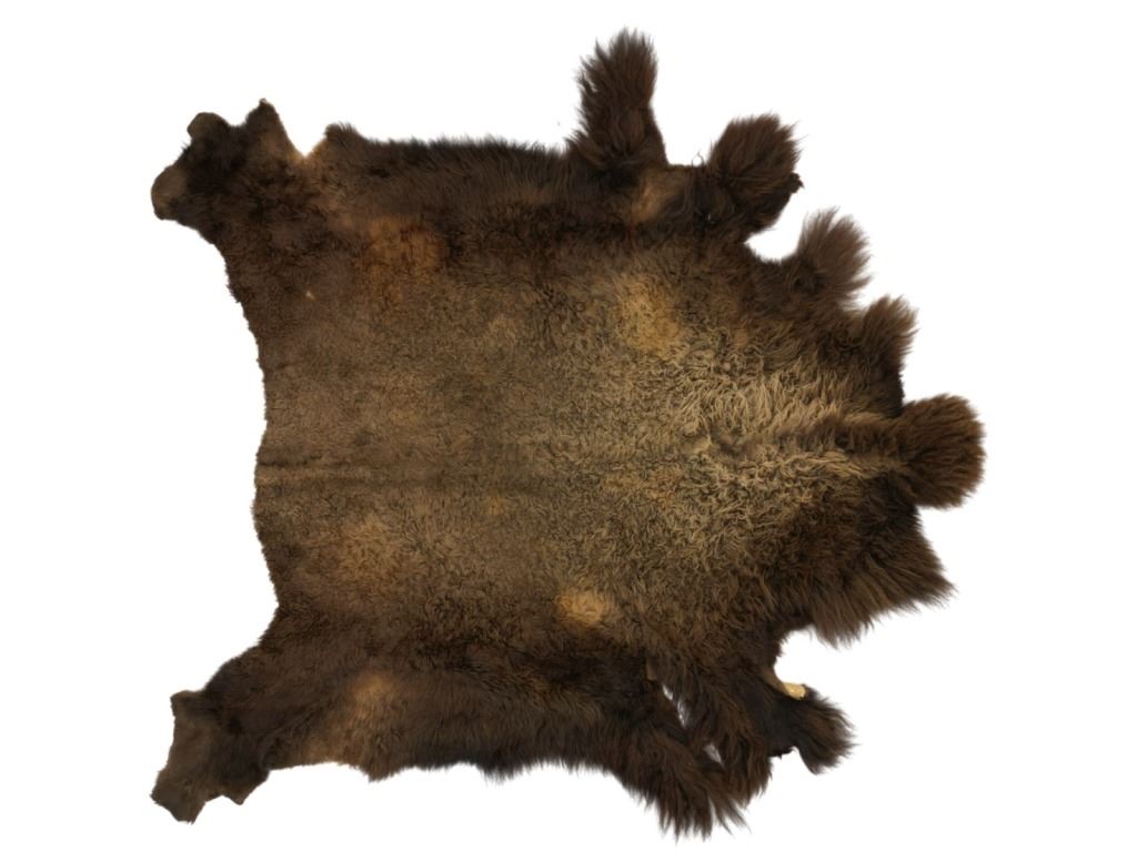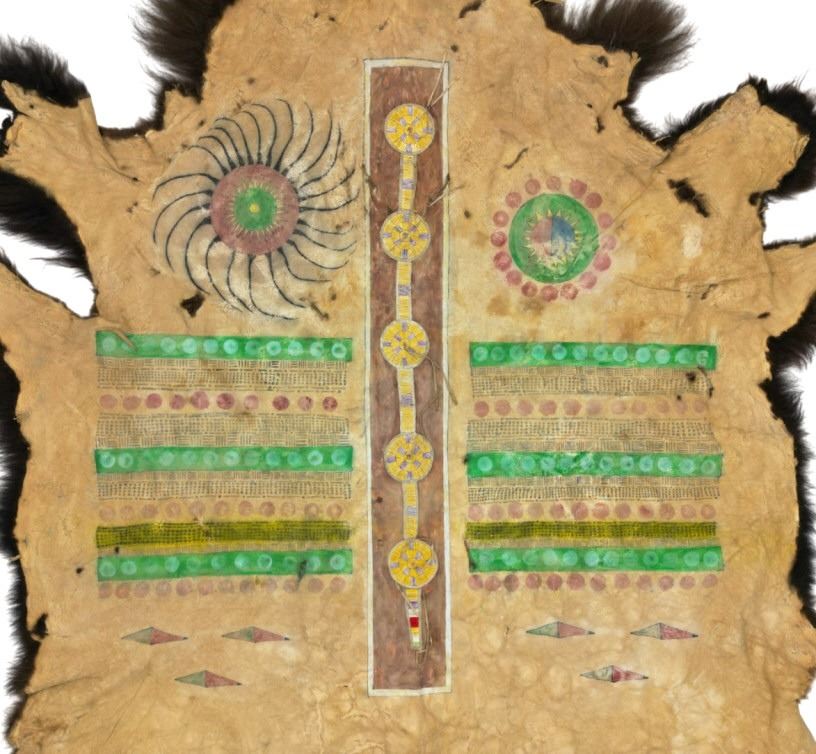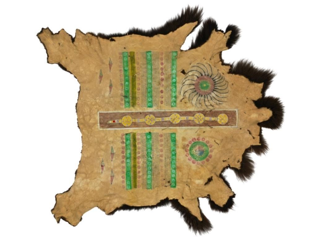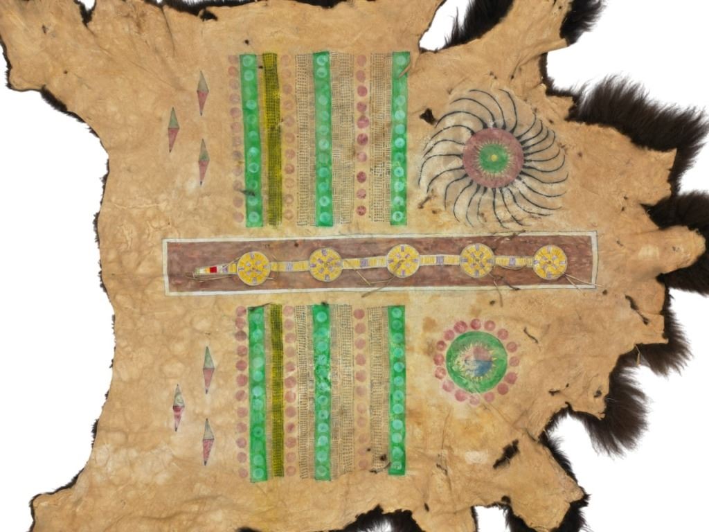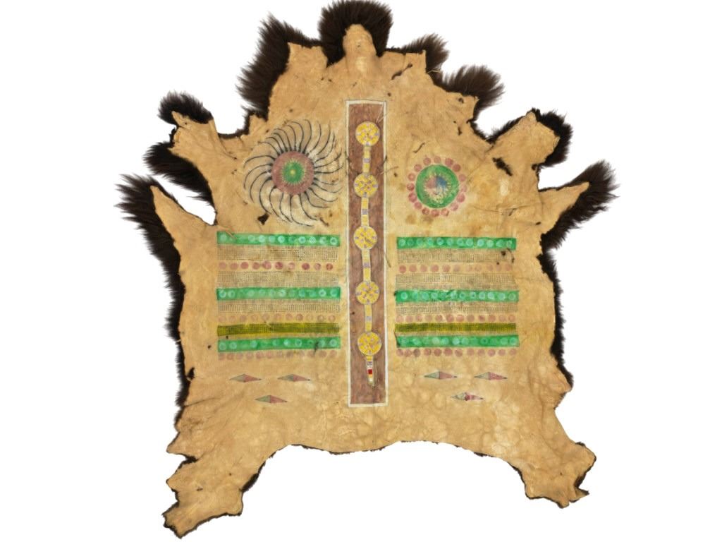 The lot features a fine painted buffalo bison hide wearing robe with quillwork strip collected from the Cheyenne Running Elk Family at Pine Ridge Indian Reservation by noted western collector Jim Aplan of Piedmont, South Dakota in the 1970's. The robe exhibits a nice Indian tanned full, large buffalo / bison hide with fur and has been elaborately polychrome painted in classic Plains and Northern Plains patterns, typical of the Mandan Hidatsa and Cheyenne showing a linear dot and line pattern with circular sun-wheel pattern with colors of yellow, black, green, red, blue and white in mineral pigment paints such as yellow ocher / ochre. Down the center shows an old, beautifully done porcupine quill quillwork blanket strip done on Indian tanned hide sinew sewn and attached to the hide. The quillwork blanket strip shows Indian tanned hide fringes with wound glass old red white trade beads as well as colors of yellow, purple, red, green, and white / cream natural. These large tanned, painted buffalo bison hides were often worn as robes in the winter months and used in the tipi in the summer months; worn with the fur on the inside and the beautiful painted design on the outside. Often the robe started fairly simple and was added to as important events happened in the Native families life or history. Many of these painted buffalo hides are mistaken as being “rugs” but were actually wearing blankets. Provenance: Collected from the Cheyenne Running Elk Family at the Pine Ridge Indian Reservation by Jim Aplan of Piedmont, South Dakota in the 1970's (a noted Western and Native American artifact dealer and collector). The paint is well kept and likely preserved or kept up over the years. The hide shows some holes from tanning and use, but the hide is very well kept and supple with much of the hair on the back. The piece did not see much use as it is well kept. Truly a stunning example. Measures overall 102-inches (8 ½ feet) by 91-inches (7 ½ feet).