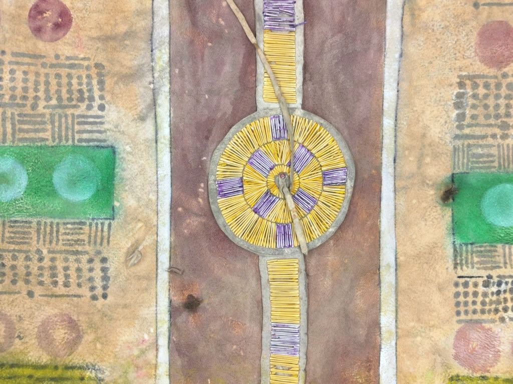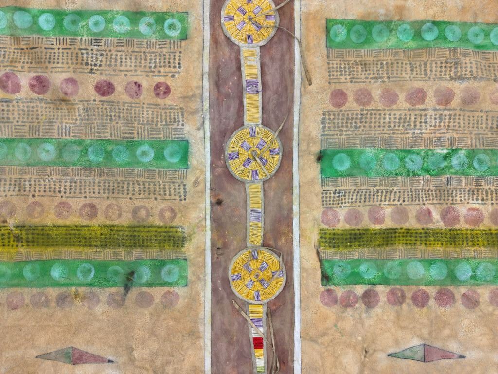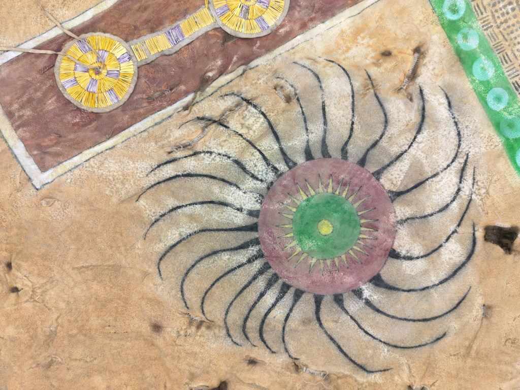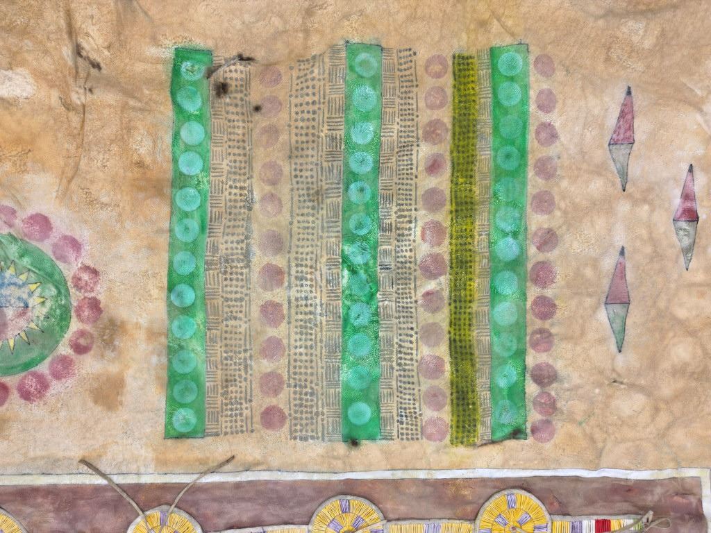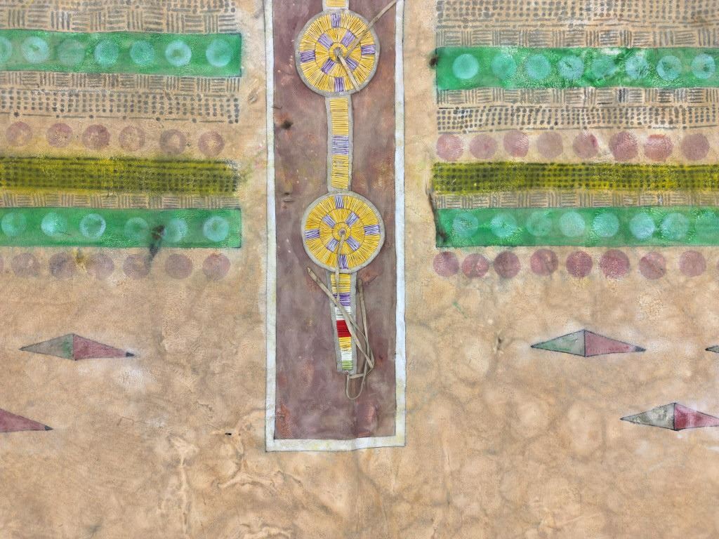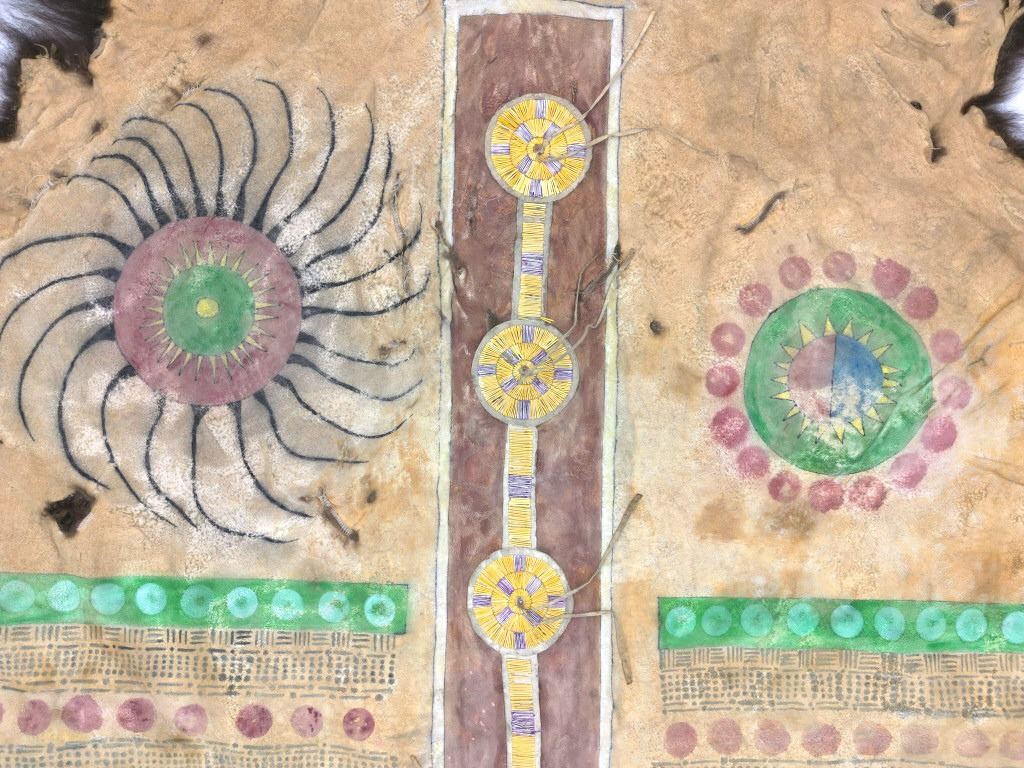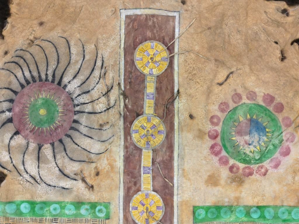 The lot features a fine painted buffalo bison hide wearing robe with quillwork strip collected from the Cheyenne Running Elk Family at Pine Ridge Indian Reservation by noted western collector Jim Aplan of Piedmont, South Dakota in the 1970's. The robe exhibits a nice Indian tanned full, large buffalo / bison hide with fur and has been elaborately polychrome painted in classic Plains and Northern Plains patterns, typical of the Mandan Hidatsa and Cheyenne showing a linear dot and line pattern with circular sun-wheel pattern with colors of yellow, black, green, red, blue and white in mineral pigment paints such as yellow ocher / ochre. Down the center shows an old, beautifully done porcupine quill quillwork blanket strip done on Indian tanned hide sinew sewn and attached to the hide. The quillwork blanket strip shows Indian tanned hide fringes with wound glass old red white trade beads as well as colors of yellow, purple, red, green, and white / cream natural. These large tanned, painted buffalo bison hides were often worn as robes in the winter months and used in the tipi in the summer months; worn with the fur on the inside and the beautiful painted design on the outside. Often the robe started fairly simple and was added to as important events happened in the Native families life or history. Many of these painted buffalo hides are mistaken as being “rugs” but were actually wearing blankets. Provenance: Collected from the Cheyenne Running Elk Family at the Pine Ridge Indian Reservation by Jim Aplan of Piedmont, South Dakota in the 1970's (a noted Western and Native American artifact dealer and collector). The paint is well kept and likely preserved or kept up over the years. The hide shows some holes from tanning and use, but the hide is very well kept and supple with much of the hair on the back. The piece did not see much use as it is well kept. Truly a stunning example. Measures overall 102-inches (8 ½ feet) by 91-inches (7 ½ feet).