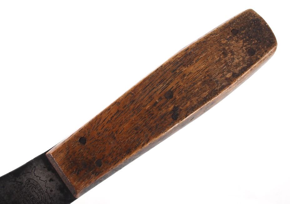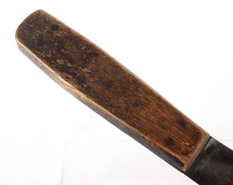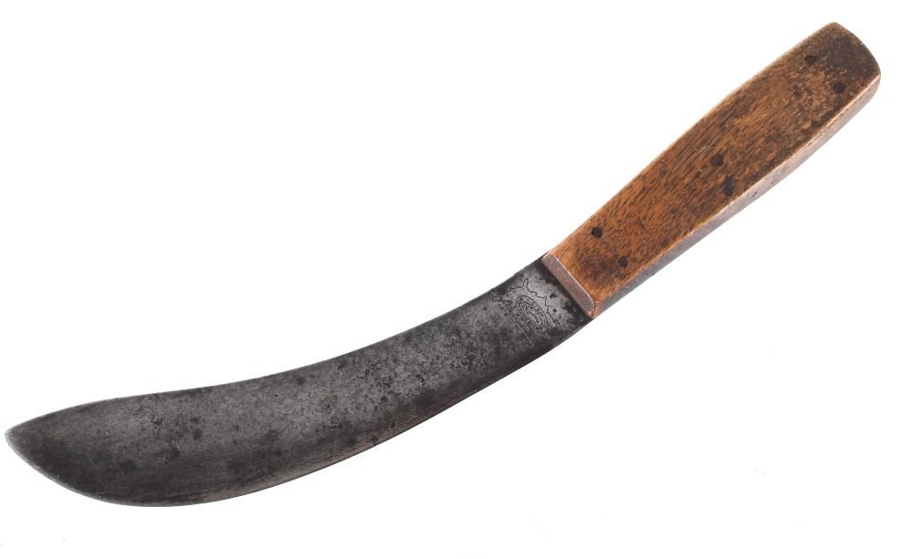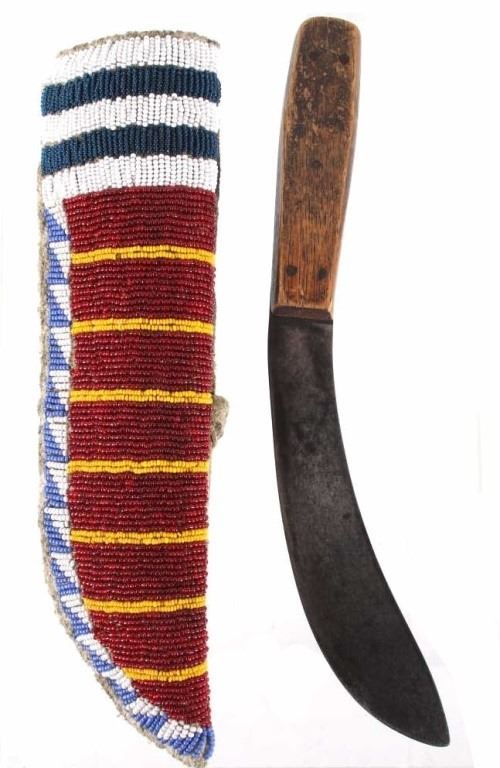 The lot features a Cheyenne beaded Buffalo hide sheath and Lamson & Goodnow, c. 1900-1930’s, trade knife. The sheath is comprised of Indian brain-tanned Buffalo Bison hide with an original belt tie strap still attached and glass trade seed beads in a geometric Cheyenne pattern on the front. The beadwork shows a chalk white and semi-transparent dark blue striped top with border of chalk white and medium blue and central pattern of semi-transparent red and greasy corn yellow. The knife is 11-inches-long overall, with a curved skinning blade hallmarked “MADE IN U.S. BY LAMSON & GOODNOW MFG. CO.” with the outline of the continental United states and the iconic oval hallmark at the center holding the sideways anchor. Lamson and Goodnow was established in Massachusetts in 1837, being one of the oldest cutlery manufacturers in the United States. Their blades became well known and heavily used during the Civil War and Indian Wars and are still made to this day. Earlier examples show one and two straight line hallmarks, which then later changed to the oval plaque with anchor at the center hallmark in the late 1800’s early 1900’s. The knife is in the pattern of the J. Russell & Co. Green River Works Buffalo Skinning knife or the Foster Bros. knife. The set shows good overall condition and expected wear from age and use. Provenance: From the ex-collection of Tom Hardy Indianapolis, Indiana. Sheath measures overall 10.5” L by 3” W and the knife is 11” L.