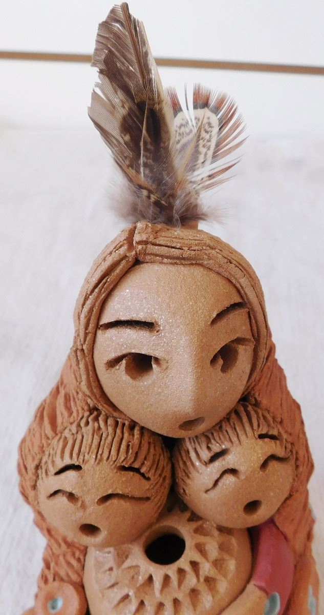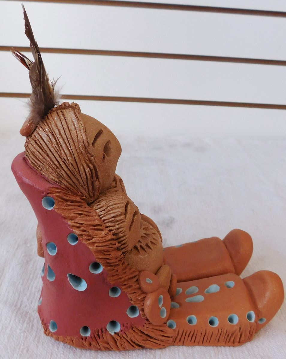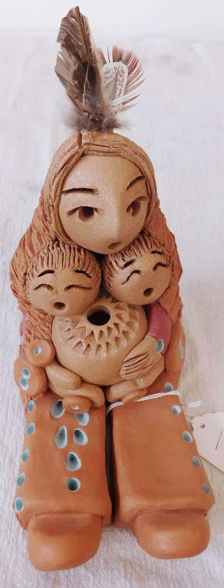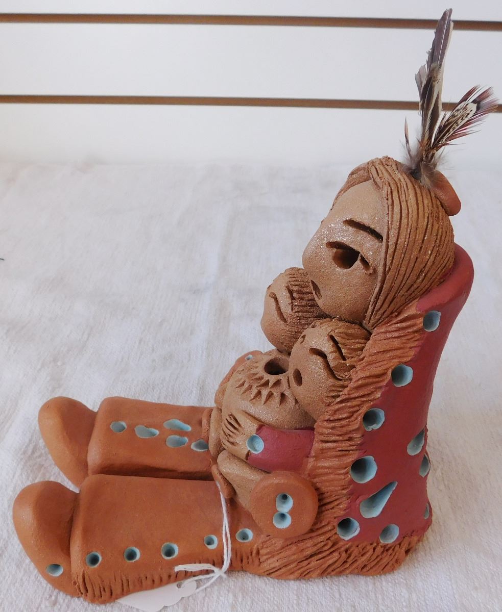 Cheyenne Storyteller Doll, circa 1990s. Made of clay, paint and feathers, this item measures roughly 8" x 4" x 7". Signed Cheyenne Jim. Storyteller holding a pot and 2 young ones. Note the blue paint accents and unique carving. Condition: Great, see images. Shipping: $25.00 w/insurance and double-boxed.