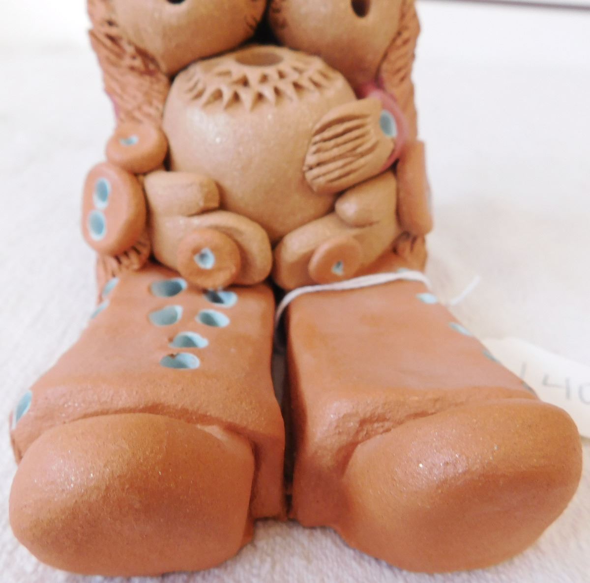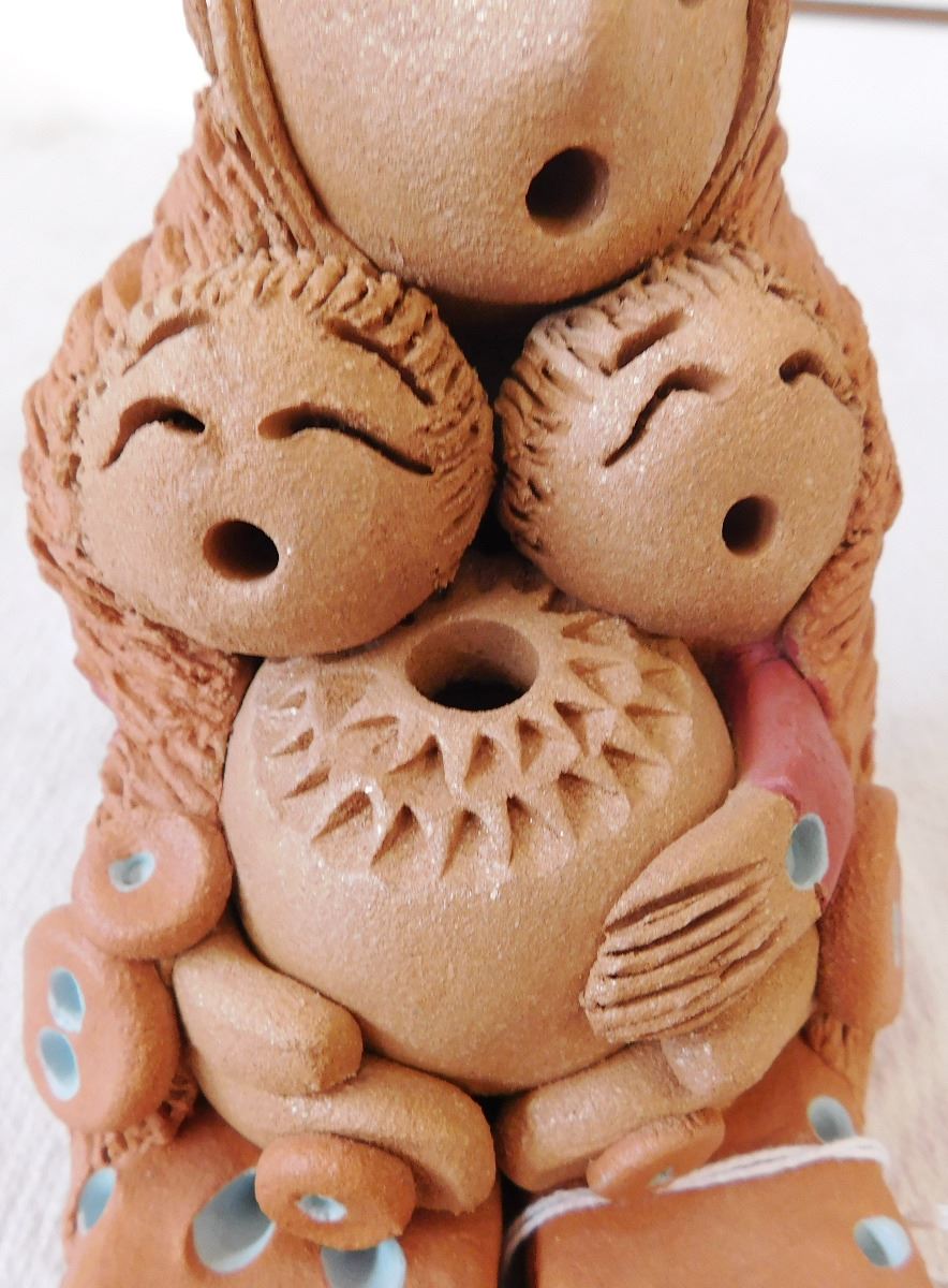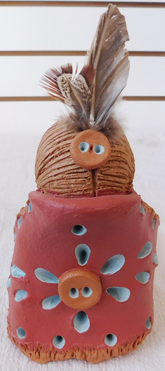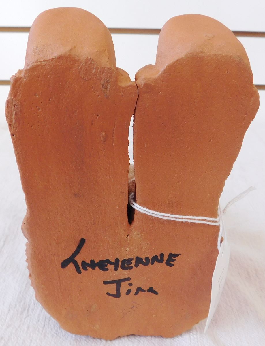 Cheyenne Storyteller Doll, circa 1990s. Made of clay, paint and feathers, this item measures roughly 8" x 4" x 7". Signed Cheyenne Jim. Storyteller holding a pot and 2 young ones. Note the blue paint accents and unique carving. Condition: Great, see images. Shipping: $25.00 w/insurance and double-boxed.