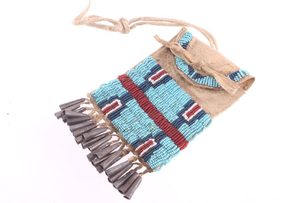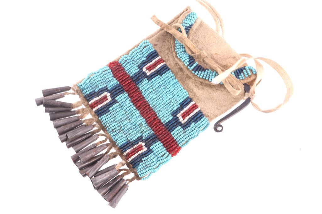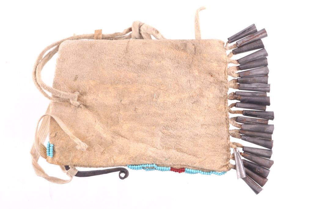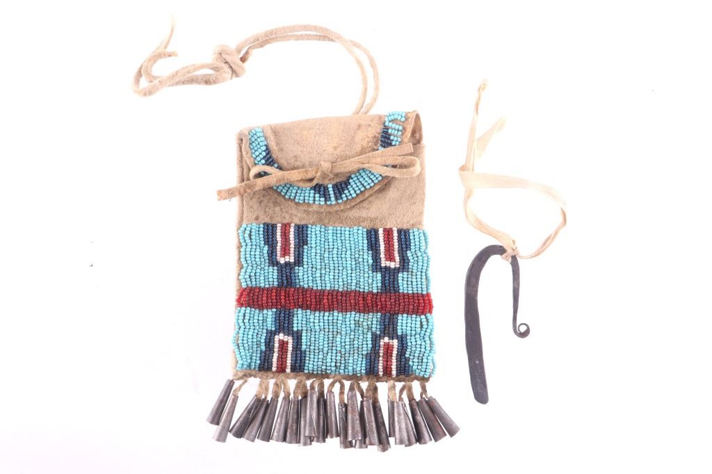 The lot features a nice 19th Century beaded hide strike-a-lite pouch or flat bag with striker from the Northern Cheyenne Native American Indians of Wyoming. The piece is comprised of Indian brain tanned buckskin with original tie straps and belt straps still intact, along with rolled tin jingle dangle cone fringe at the base and nice typical Cheyenne geometric beaded pattern along the front and flap. The piece shows a nice supple hide and little to no bead loss. The beadwork is all old glass trade seed beads in colors of sky padre light blue, chalk white, semi-transparent red, and a cobalt-like semi-transparent blue. Also included in the lot is the iron striker with a strip of some type of cloth or ribbon tied on. The iron striker is blacksmith forged with nice flourish. The bag itself measures 6 inches long, including the tin cones but not the strap, by 3 ½ inches wide.