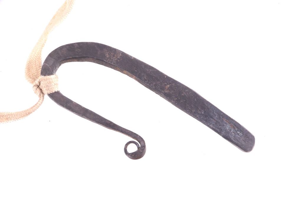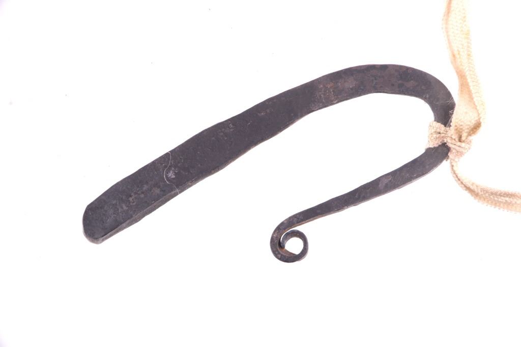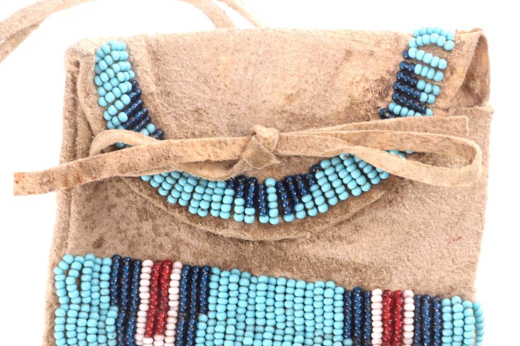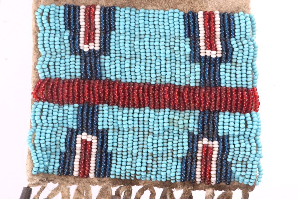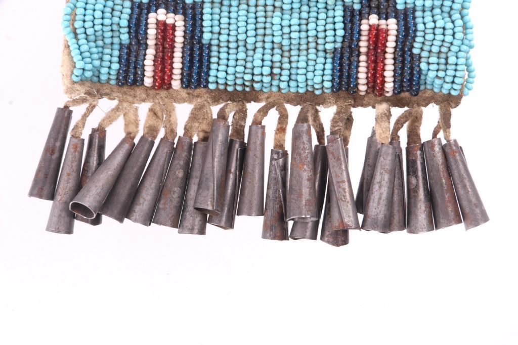 The lot features a nice 19th Century beaded hide strike-a-lite pouch or flat bag with striker from the Northern Cheyenne Native American Indians of Wyoming. The piece is comprised of Indian brain tanned buckskin with original tie straps and belt straps still intact, along with rolled tin jingle dangle cone fringe at the base and nice typical Cheyenne geometric beaded pattern along the front and flap. The piece shows a nice supple hide and little to no bead loss. The beadwork is all old glass trade seed beads in colors of sky padre light blue, chalk white, semi-transparent red, and a cobalt-like semi-transparent blue. Also included in the lot is the iron striker with a strip of some type of cloth or ribbon tied on. The iron striker is blacksmith forged with nice flourish. The bag itself measures 6 inches long, including the tin cones but not the strap, by 3 ½ inches wide.