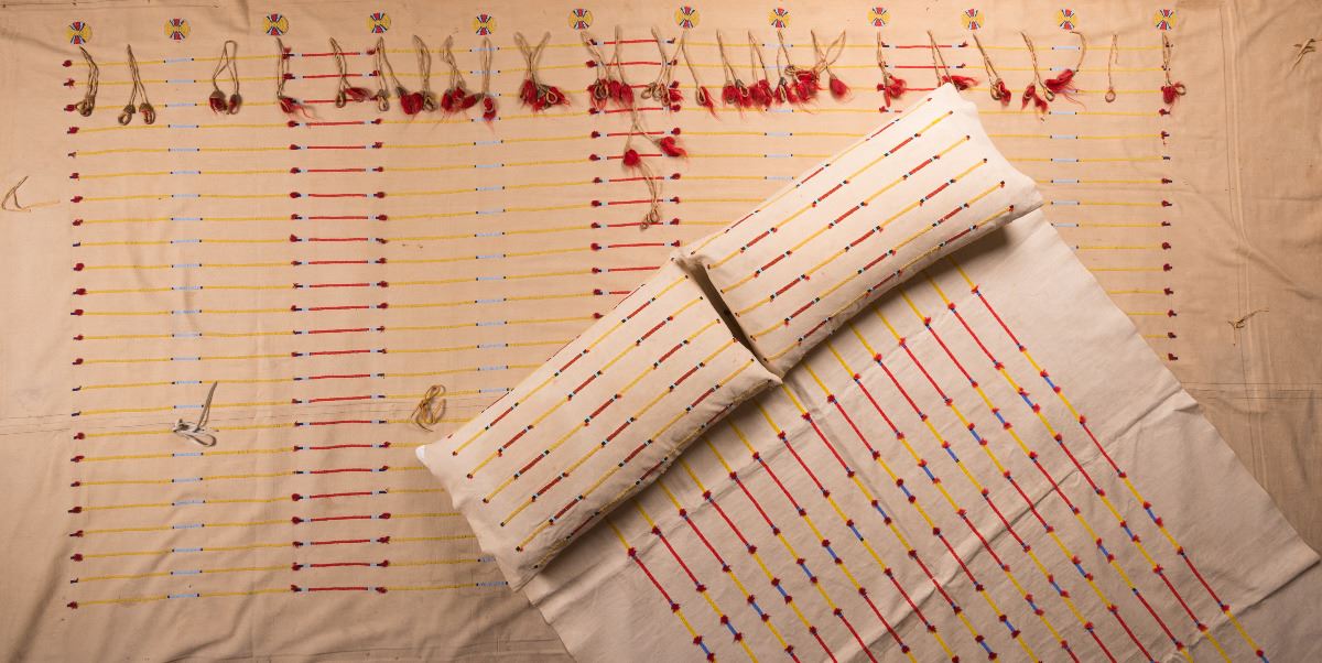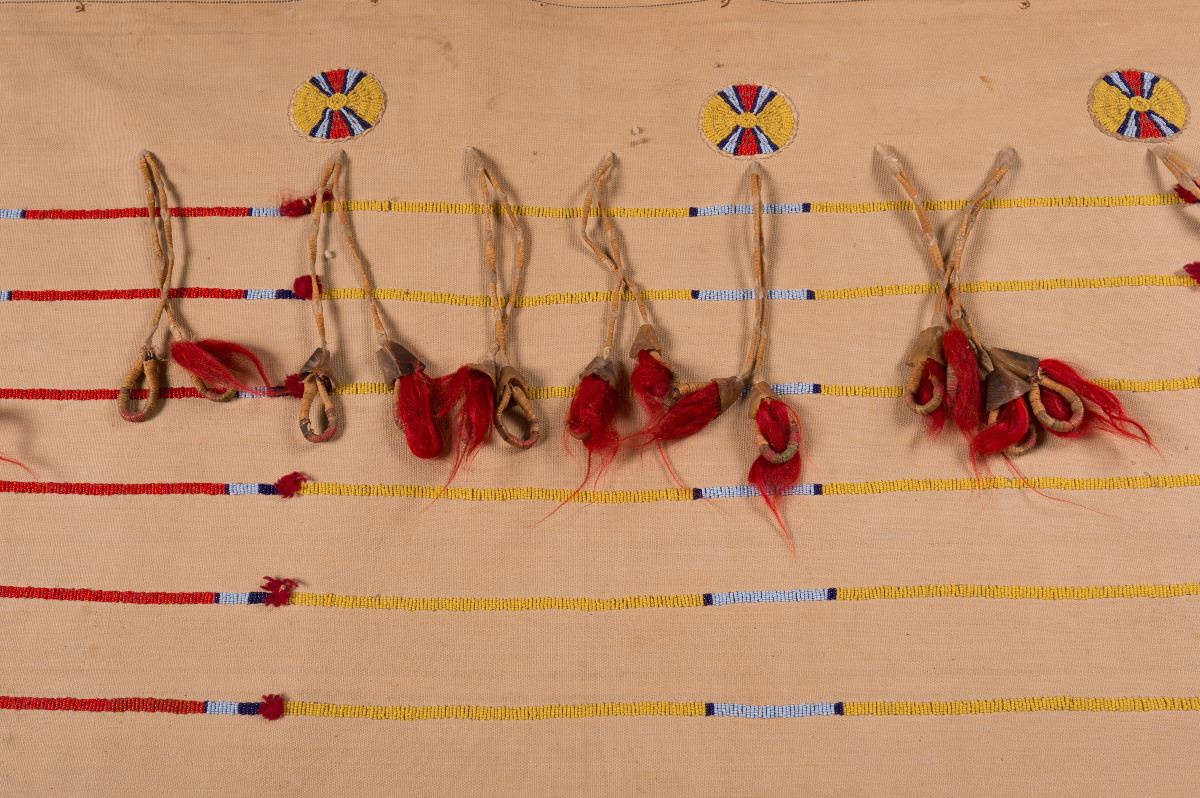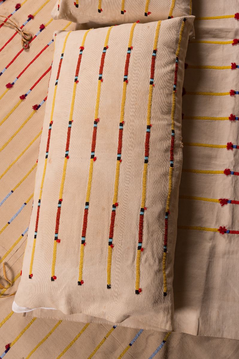 Cheyenne Teepee Liner, Bed Cover and Pillows. 11'2" x 6'7" liner along with a 6' x 4'11" bed spread and two 2'5" x 1'4" pillows constructed from sections of army tent canvas and decorated with linear bands of beadwork in Cheyenne holy colors. Liner is adorned with beaded medallions with cornhusk wrapped suspensions terminating in deer dewclaw rattles. Circa 1900. Provenance: Ex-Ken Canfield Collection.
