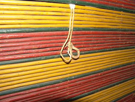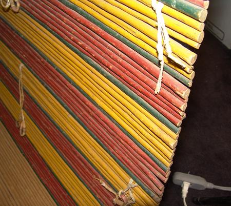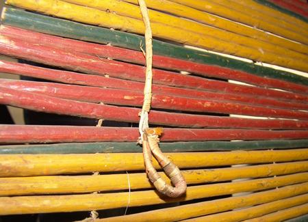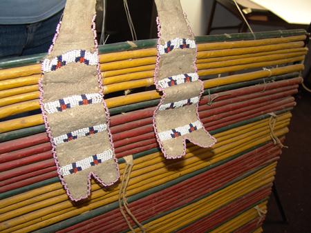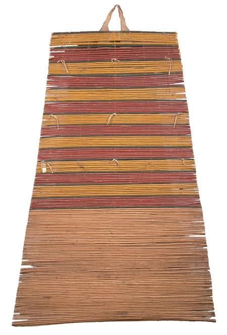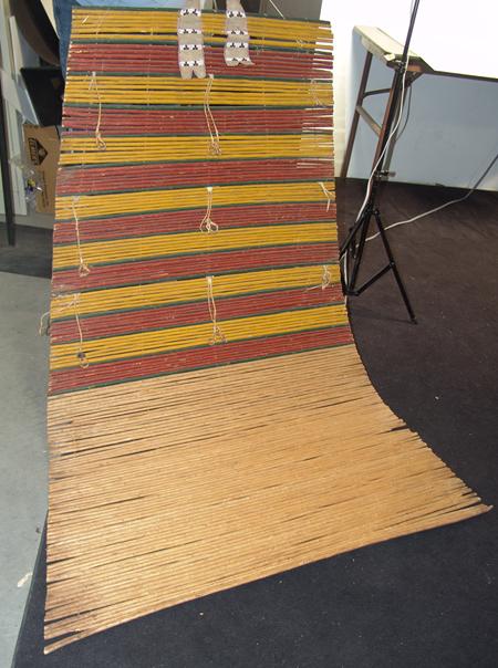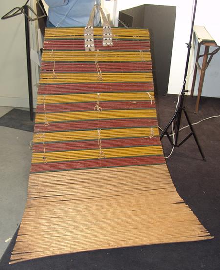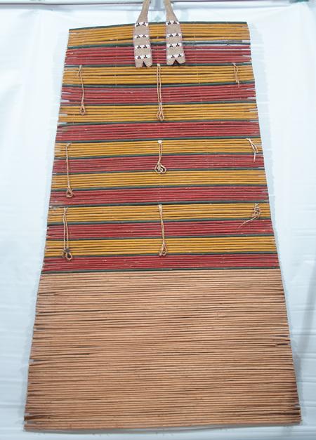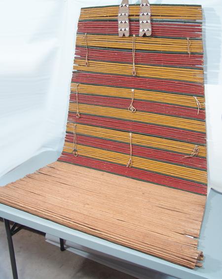 Traditional backrest constructed of painted willow rods lashed with buckskin thong - shows use and great patina. An excellent visual display. Purchased at the Franklin Gallery in 1976 for $1200; appraisal value $1200. 62" x 42"