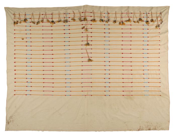 Cheyenne Tipi Liner. 111" x 84". On canvas. Yarn tufts with beaded strips. C. 1910. Belonged to Sam Walker, son of Cheyenne Chief Herbert Walker. Condition Report: Excellent condition.