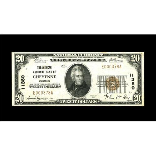 <B>Cheyenne, WY</B></I> - $20 1929 Ty. 1 <B>The American NB</B></I> Ch. # 11380<BR>This well centered and bright <B>About Uncirculated</B></I> note sold for $2,990 in August of 2003. The evidence of circulation is quite subtle and this appealing note would be right at home in any collection of uncirculated 1929 series Nationals. A premium example from an always in demand community.<BR><BR><b>Shipping:</b> Coin/Currency (<a target="_blank" href="http://www.heritageauctions.com/common/shipping.php">view shipping information</a>)