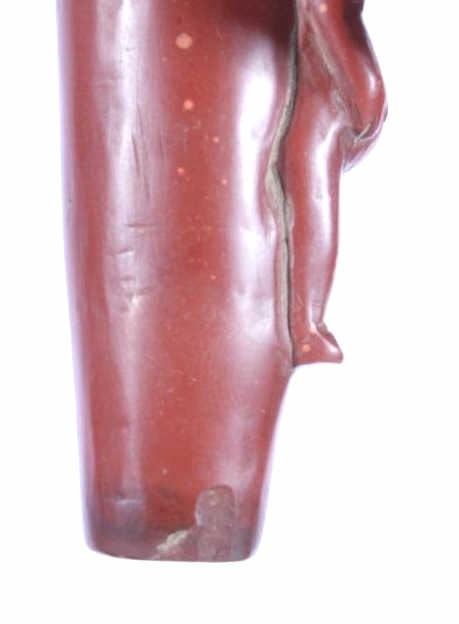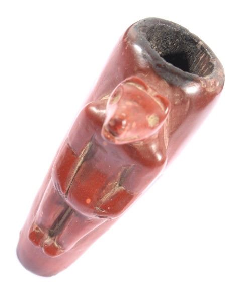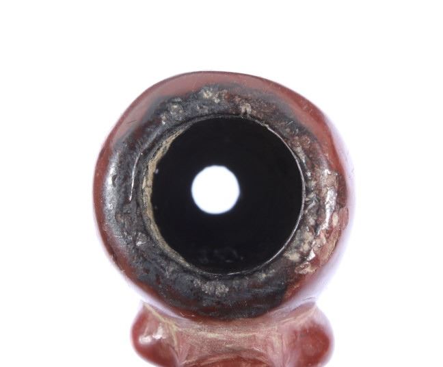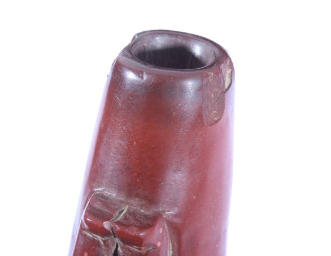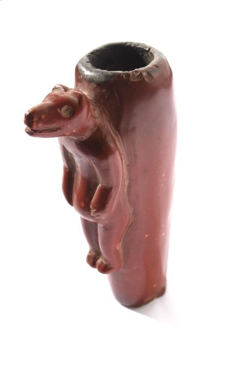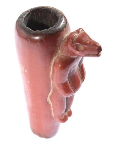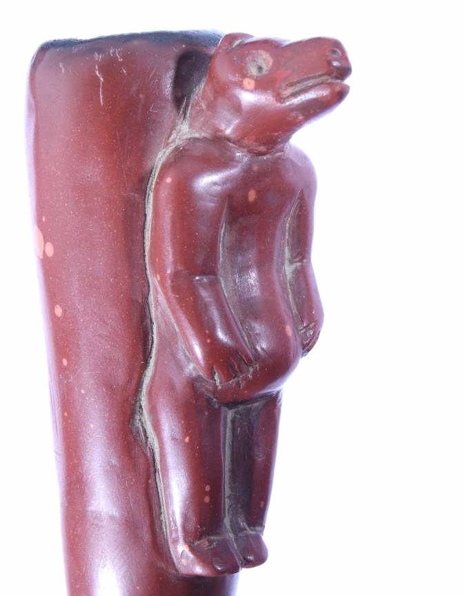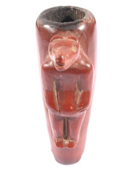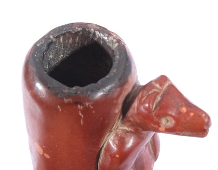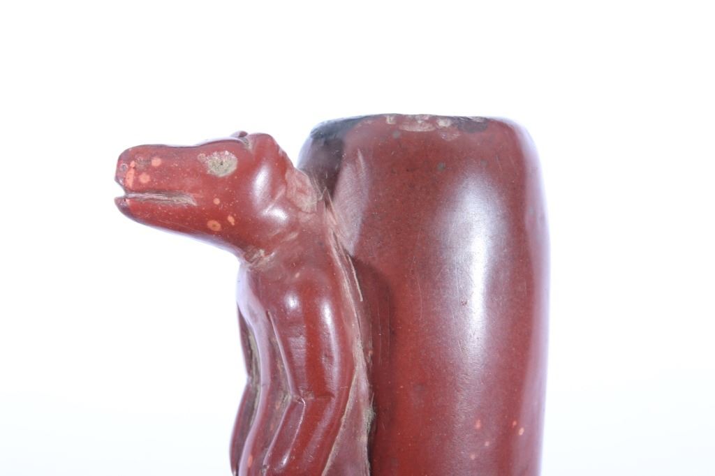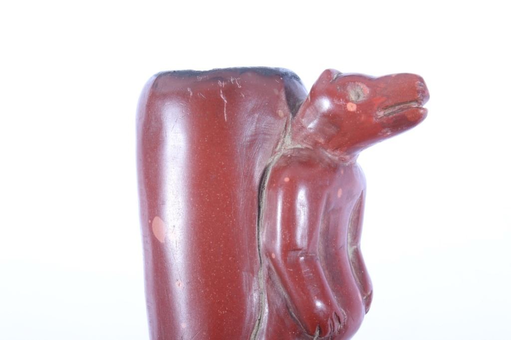 The lot features a historic and important carved wolf effigy pipe bowl from the Cheyenne Native American Indian Wolf Clan dating to circa mid to late 1800’s. The piece shows an expertly pipestone catlinite material with a full standing wolf’s body. The Dog Soldiers or Dog Men were part of the Wolf Clan of the Cheyenne Native American Indian tribe and were historically documented as one of the elite highly skilled groups of warriors. The Dog Soldier military society was the highly aggressive and effective militaristic arm of the Northern and Southern Cheyenne and were established in circa 1838. The pipe is believed to be from this Wolf Clan Dog Soldier select group of warriors, making it a truly rare and unique item. The relic shows an excellent original condition with no breaks, cracks, or visible repairs with the appropriate manufacture techniques and wear for its early age. Provenance: From the renowned Sundog Fine Art Bozeman, Montana collection and collected by Bruce VanLandingham. Bruce VanLandingham was a pillar in the American Indian collecting community and a respected expert. Along with being an avid collector Bruce also was the sole owner of Sundog Fine Art Gallery in Bozeman which was both part museum and gallery. Measures overall 3 inches in length by 1.75” deep at the head and having a 5/8 inch opening at its widest.
