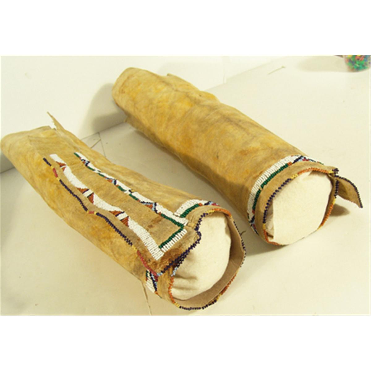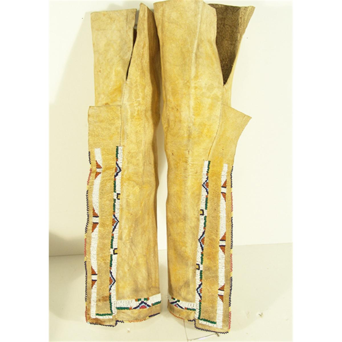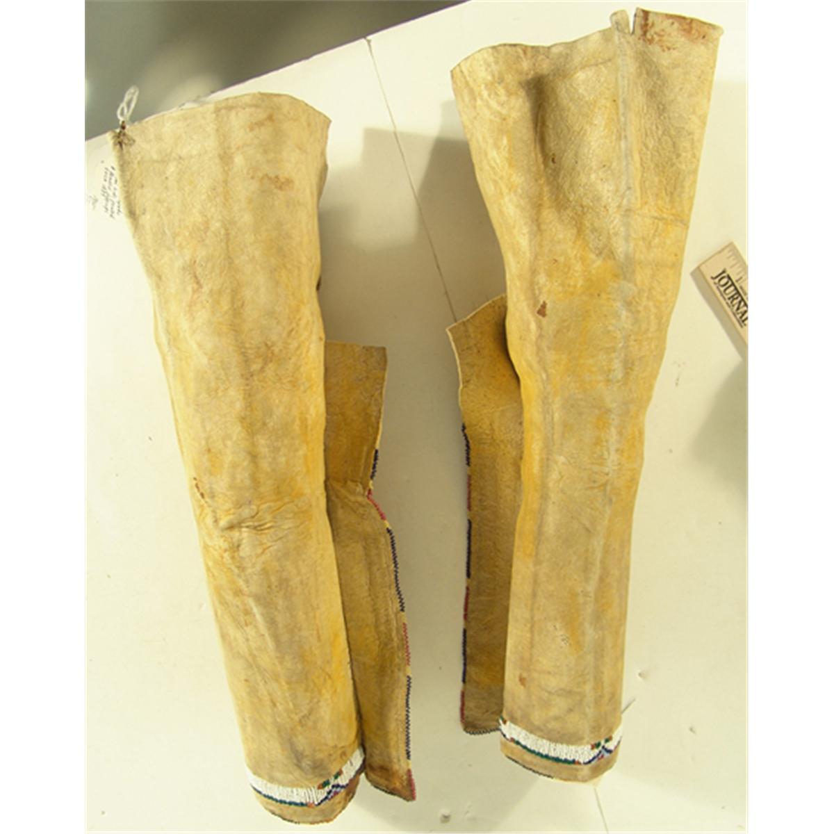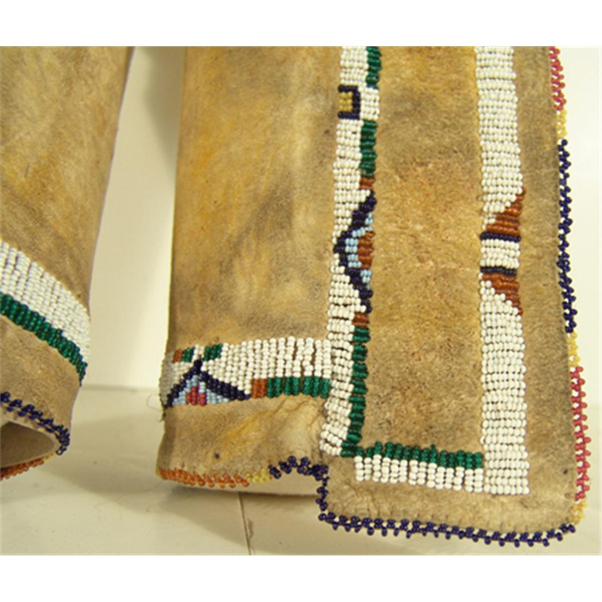 Very fine yellow ochred buckskin moccasin uppers with traditional sinew sewn lazy stitch beaded detailing and fold-over tops. Condition: very good, excellent visual. 18" long