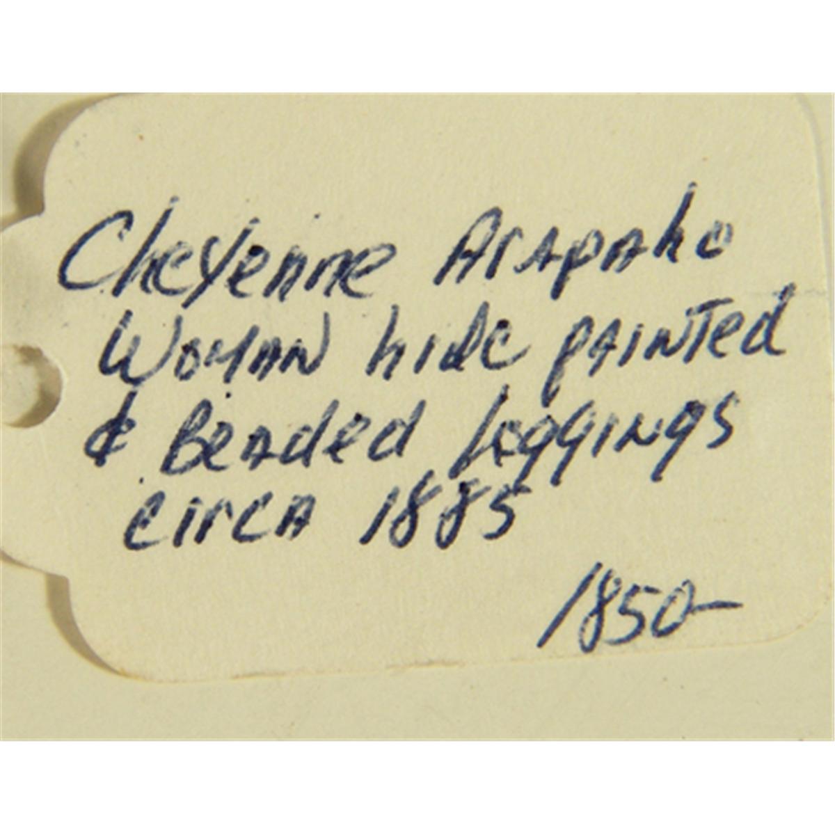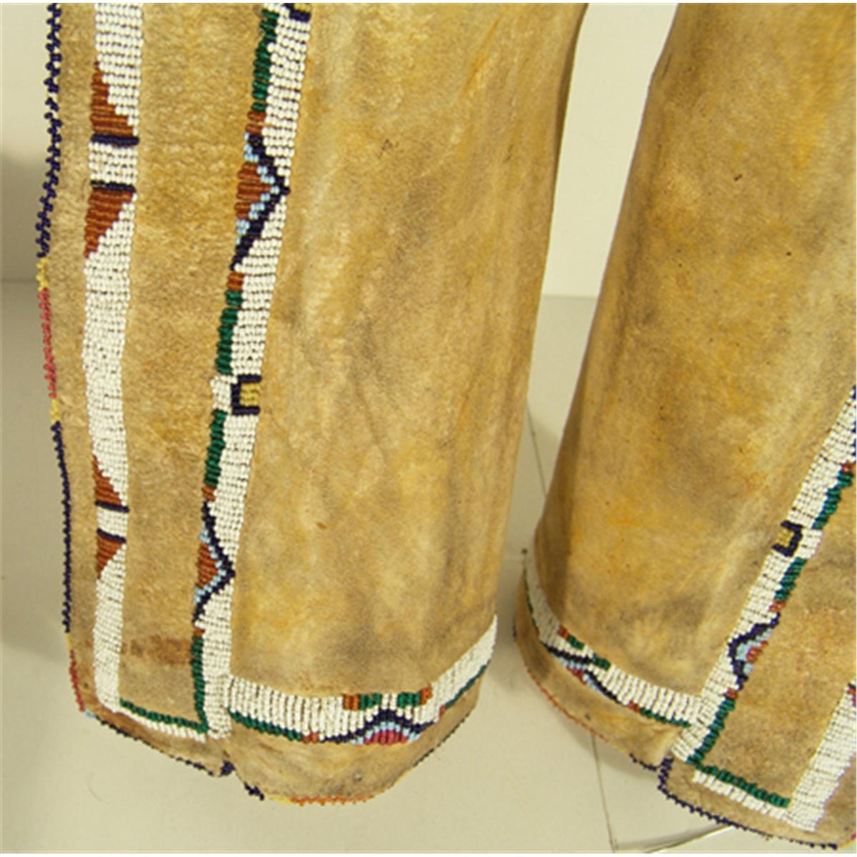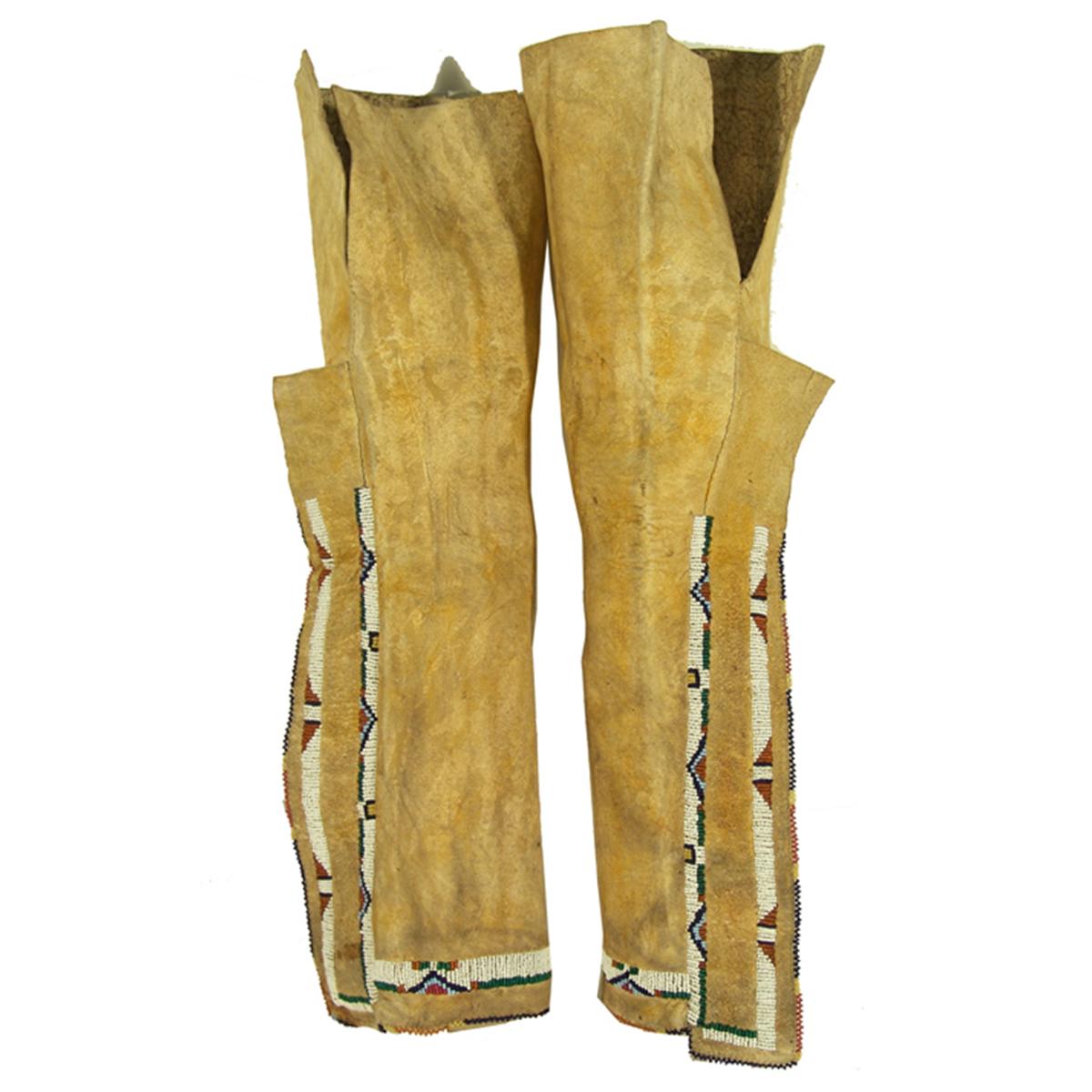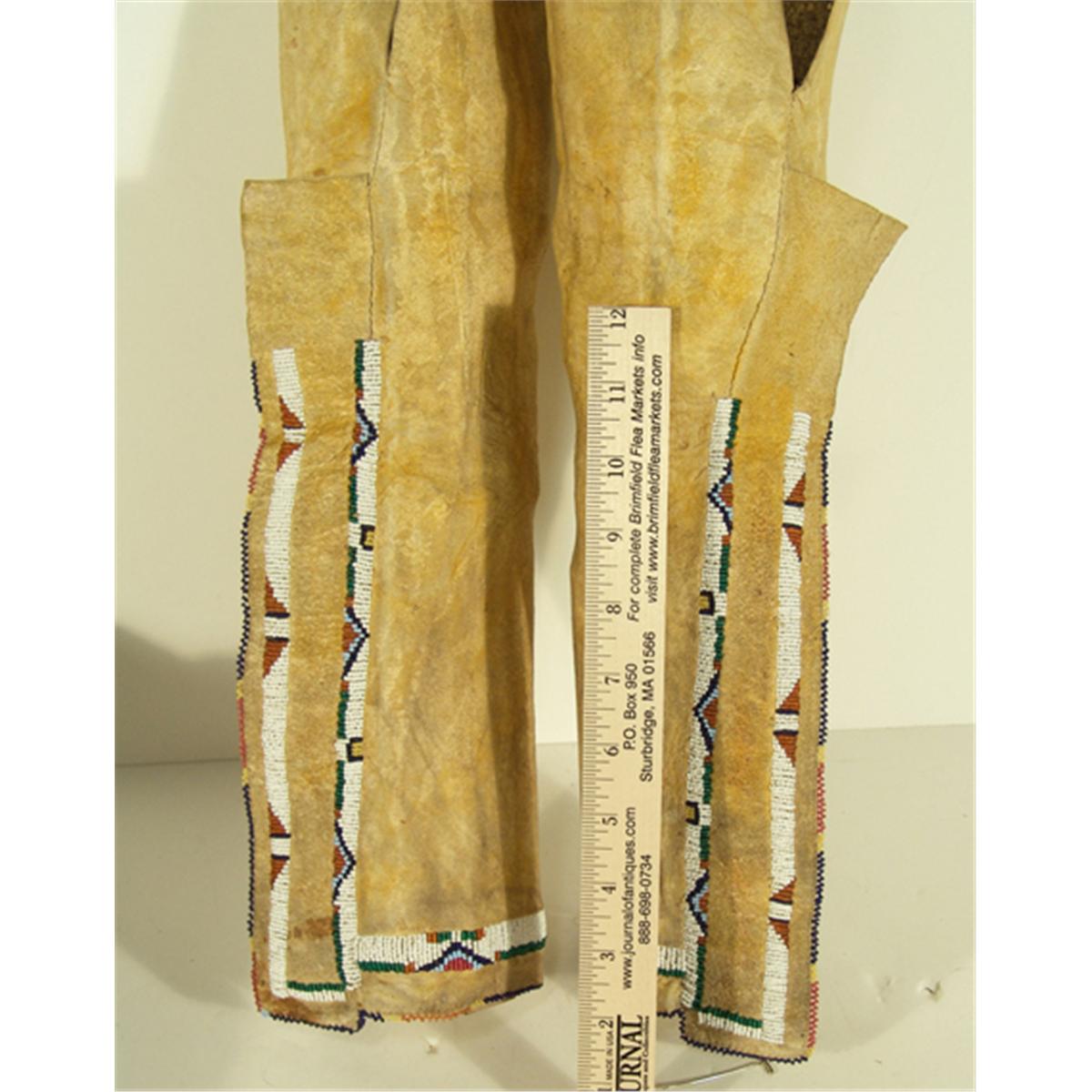 Very fine yellow ochred buckskin moccasin uppers with traditional sinew sewn lazy stitch beaded detailing and fold-over tops. Condition: very good, excellent visual. 18" long