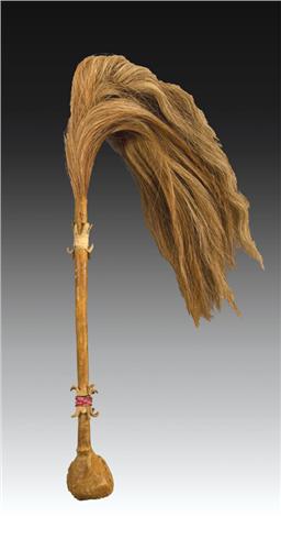 Cheyenne Woman's Skull Cracker. 32" long. Rawhide covered stone head. Horsetail. 19th century. (est $1,000-1,500)