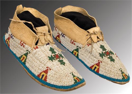 Cheyenne Beaded Moccasins. 10 3/4" long. Classic designs with rolling log design elements. c. 1910. Fine condition. (est $1,500-2,500)