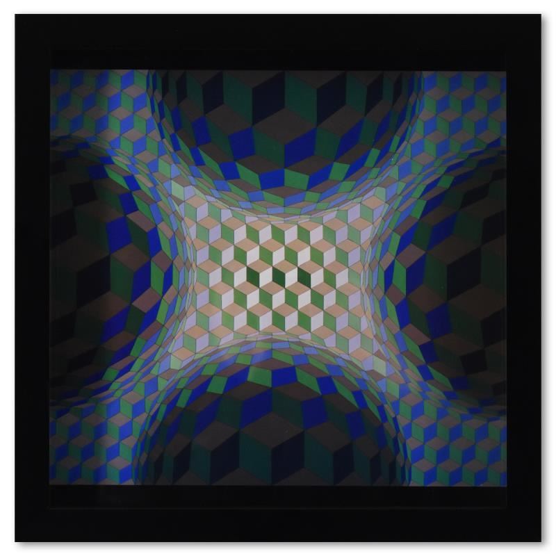 "Cheyt - Stri - Ton de la série Structures Universelles De L'Hexagone" is a heliogravure print on paper, published in 1975, by Victor Vasarely (1908-1997). This piece comes custom framed, with a letter of authenticity and with a 1976 Vasarely paperback. Measures approx. 11.5" x 11.5" (frame), 9" x 9" (image).