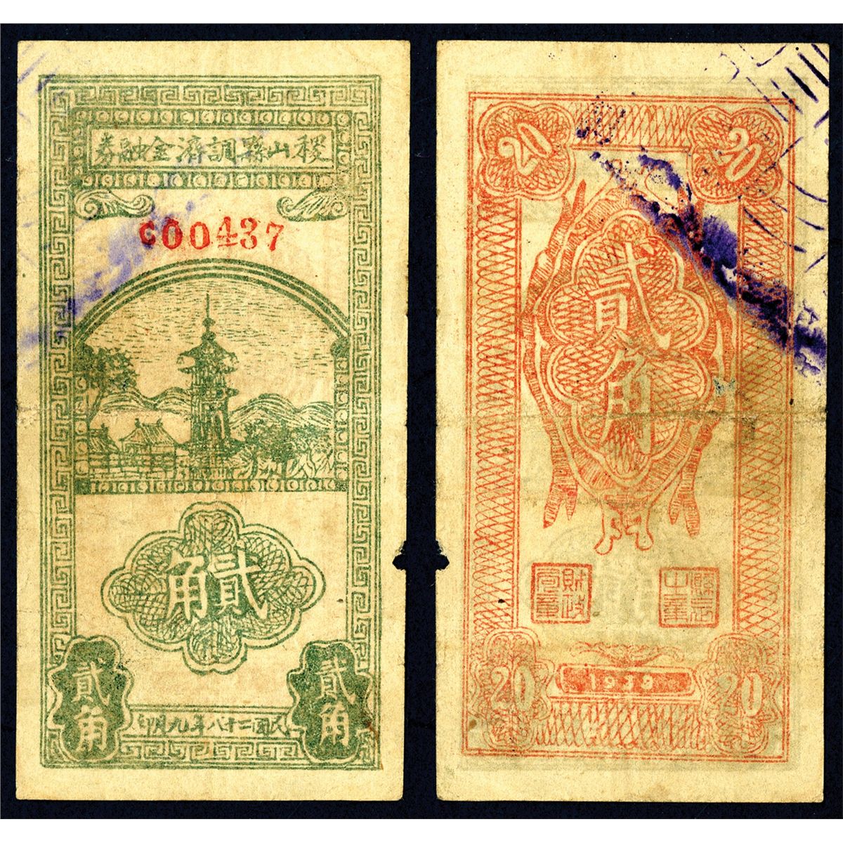 China, 20 cents, P-Unlisted, 54x106mm's, green face, back red-orange, S/N C00437, Fine condition with a small piece out of the right middle border. Scarce.