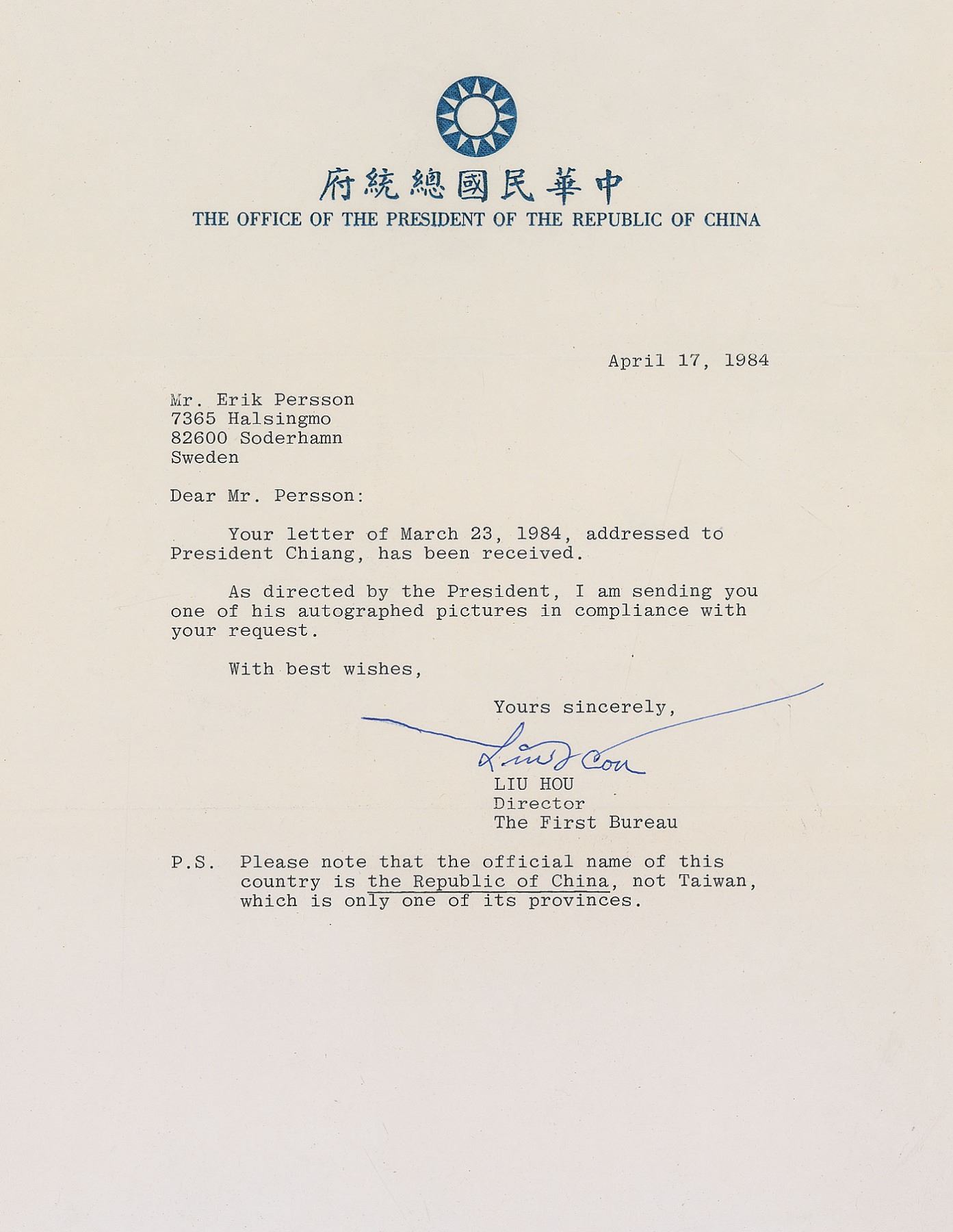 Color satin-finish 4.75 x 7 bust-length photo of Chiang Ching-kuo in a suit and tie, signed in crisp black ink in Chinese. In fine condition. Accompanied by a letter of transmittal from the office of the president of the Republic of China and by a full letter of authenticity from PSA/DNA.