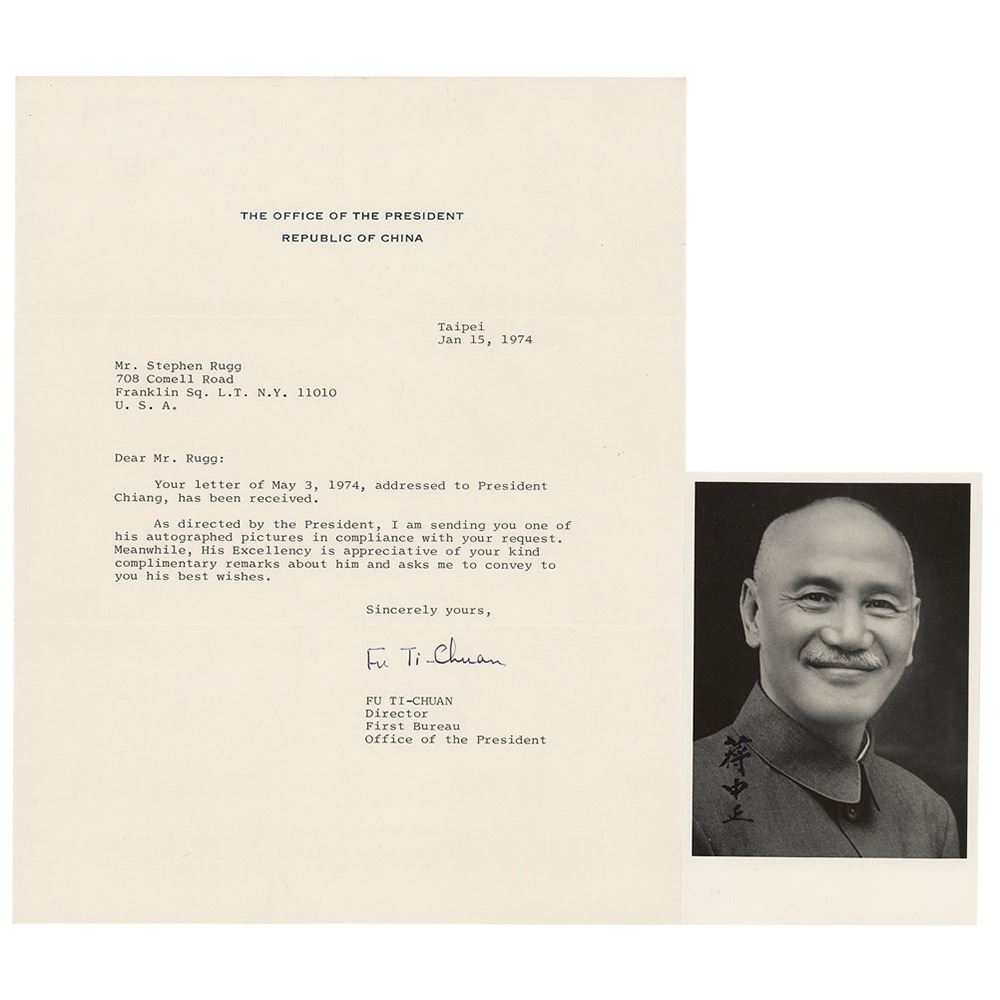Matte-finish 3.75 x 5.75 head-and-shoulders photo of Chiang Kai-shek, signed in fountain pen in Chinese. Reverse bears a Hu Chung Hsien photography stamp. Accompanied by the original transmittal letter from his office, dated January 15, 1974.