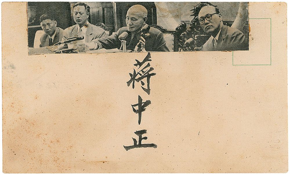 Vintage ink signature in Chinese on an off-white 5.5 x 3.25 card bearing an affixed newspaper photo of the leader. In very good condition, with scattered soiling and a few light creases.