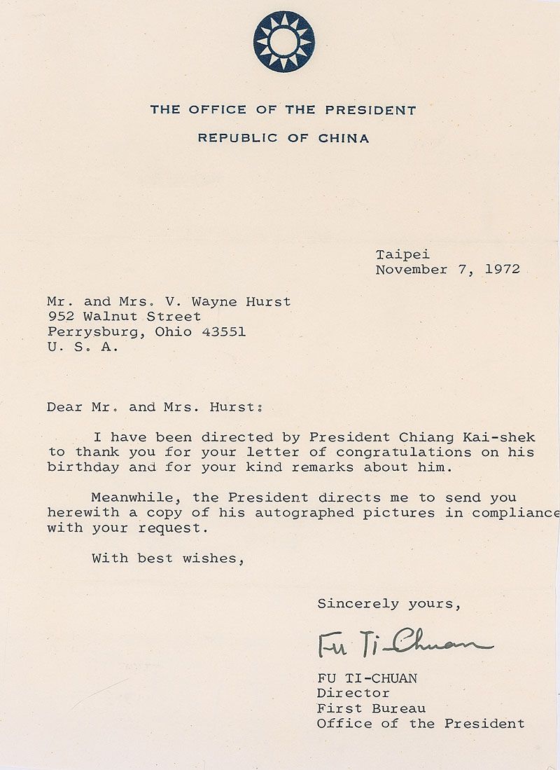 Scarce and desirable matte-finish 3.75 x 5.5 portrait of the leader, signed in black ink in Chinese. Creases to lower corners, otherwise fine condition. Accompanied by the original transmittal letter from an assistant, dated November 7, 1972, and the stamp and address clipped from the mailing envelope.