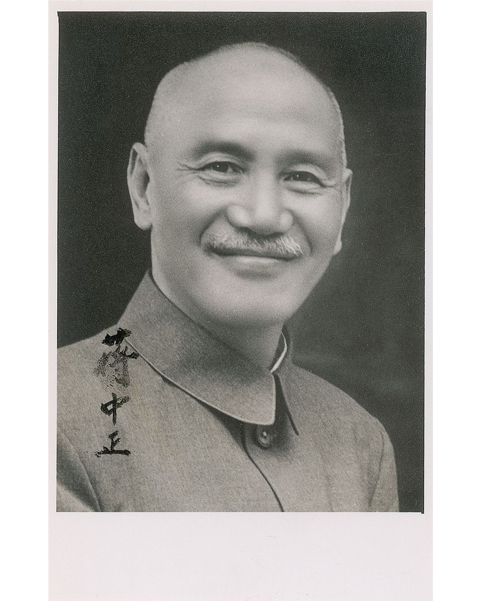 Chinese military officer and politician (1887–1975), one of the most durable leaders of the 20th century, who led the government of Republic of China from 1928 until his death. Uncommon matte-finish 3.75 x 5.75 head-and-shoulders photo, signed in black ink in Chinese. Reverse bears an ink stamp of Chiang’s personal photographer. In fine condition, with a small brush to signature.