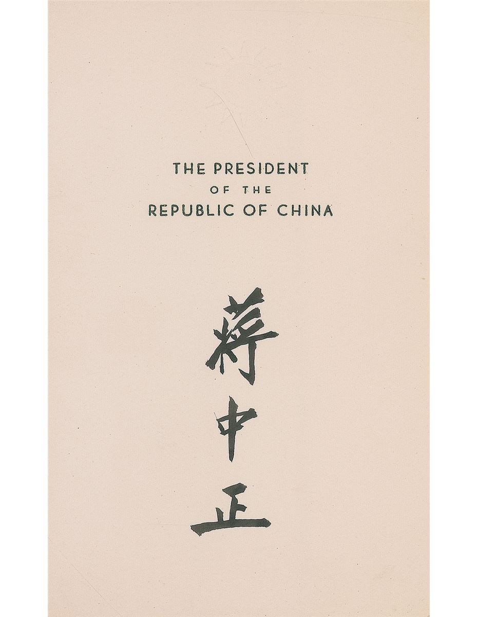Crisp black ink signature in Chinese on an off-white 3.75 x 5.75 sheet with raised lettering reading, “The President of the Republic of China,” below an embossed sun. In fine condition, with trivial wear to top edge.