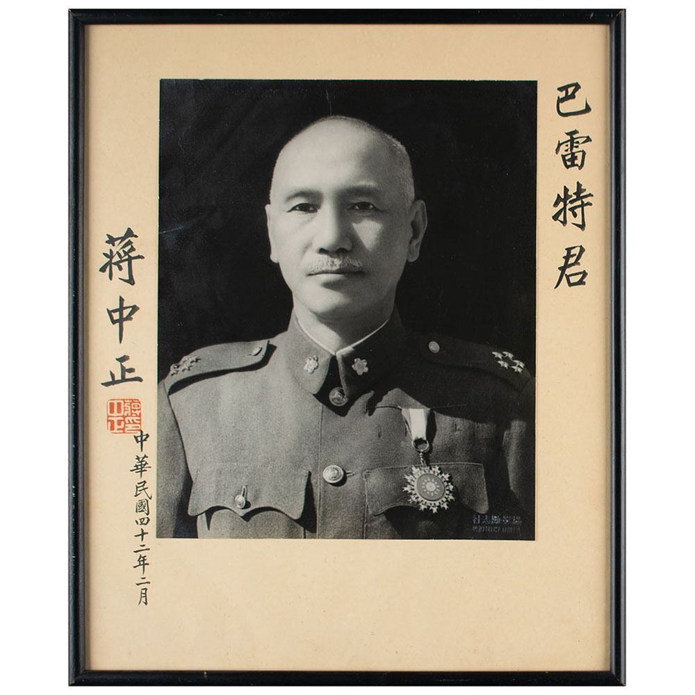 Exceptional vintage matte-finish 8.75 x 10.75 photo of Chiang Kai-shek in uniform, affixed to its original 12 x 15 mount, boldly signed and inscribed on the mount in ink in Chinese. Blindstamped in the lower right corner by the Omea photography studio. Framed and in very good to fine condition, with some creasing to the mount, a few small creases to the image, and light silvering along its perimeter.