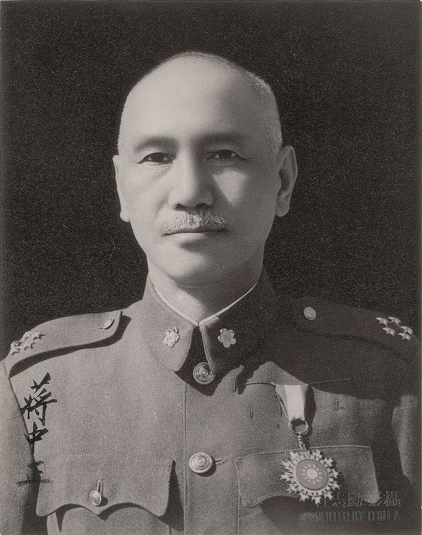 Fantastic matte-finish 5.5 x 7 photo of Chiang Kai-shek in uniform, signed in ink in Chinese. Reverse bears a Wu Chung-Yee credit stamp. In fine condition, with a light crease to the lower left corner. A desirable example, scarce in this larger size.