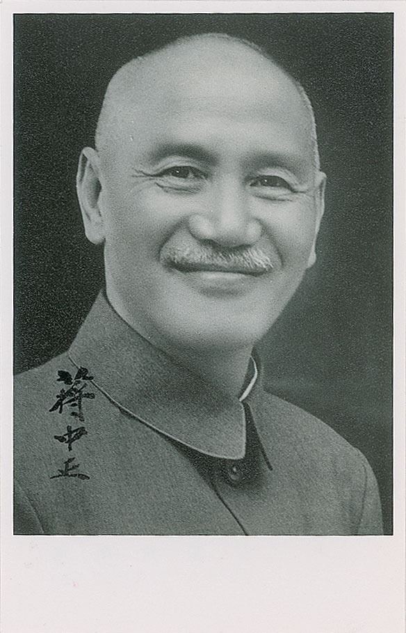 Matte-finish 3.75 x 5.75 head-and-shoulders photo of Chiang Kai-shek, signed in fountain pen in Chinese. Reverse bears a Hu Chung Hsien photography stamp. In very fine condition.