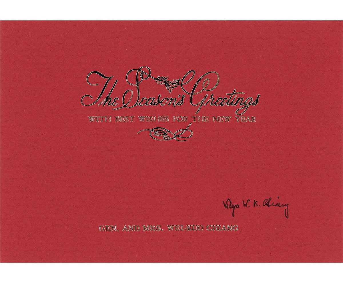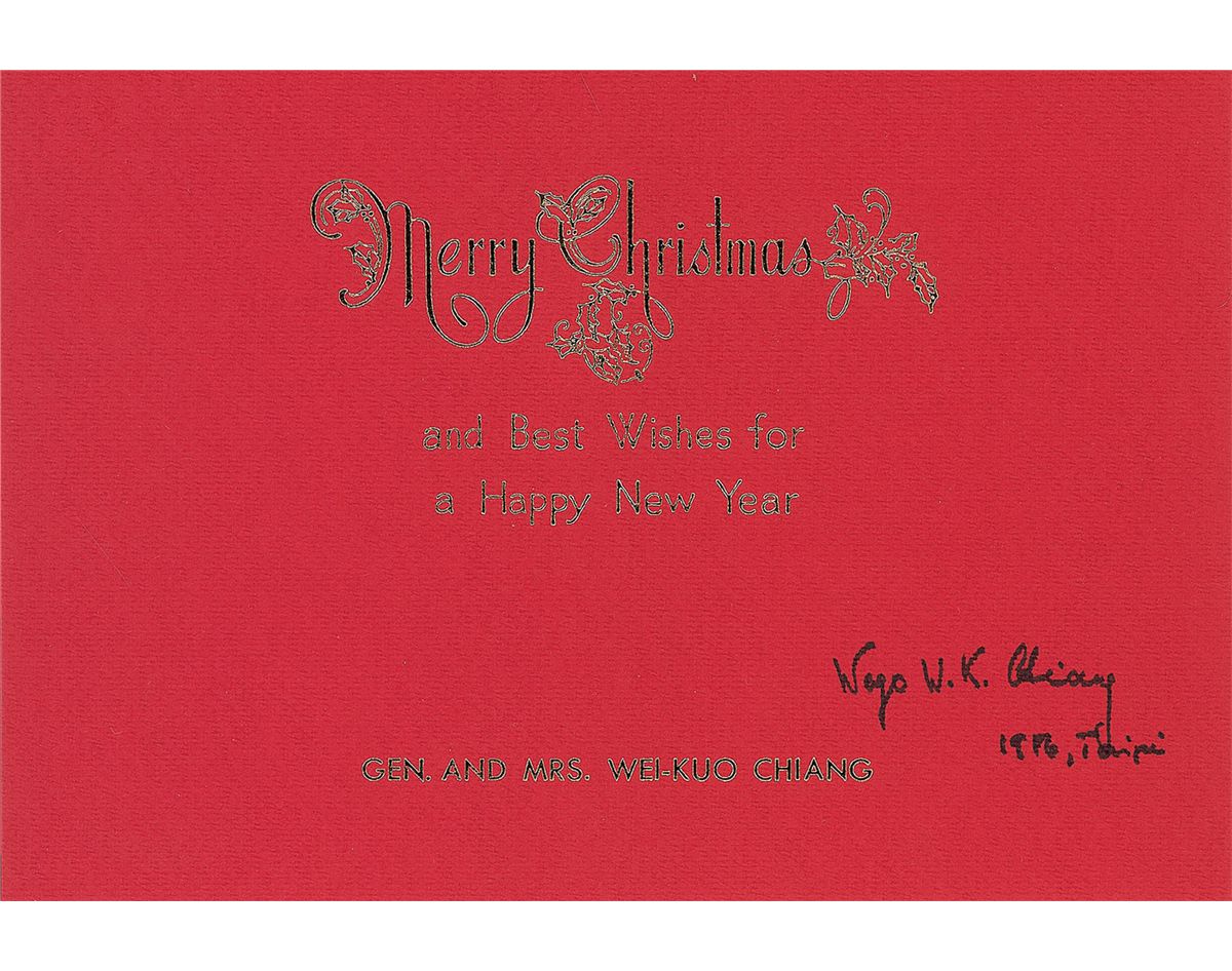 Military leader (1916–1997), and the adopted son of President Chiang Ching-kuo, whose military education in Germany and expertise with tank operations earned him a strong reputation in warfare strategy. Pair of festive red Christmas cards with embossed gold writing. Both are signed in black ink, one on the front, “Wego W. K. Chiang,” and the other on the inside, “Wego W. K. Chiang, 1986, Taipei.” In overall fine condition.