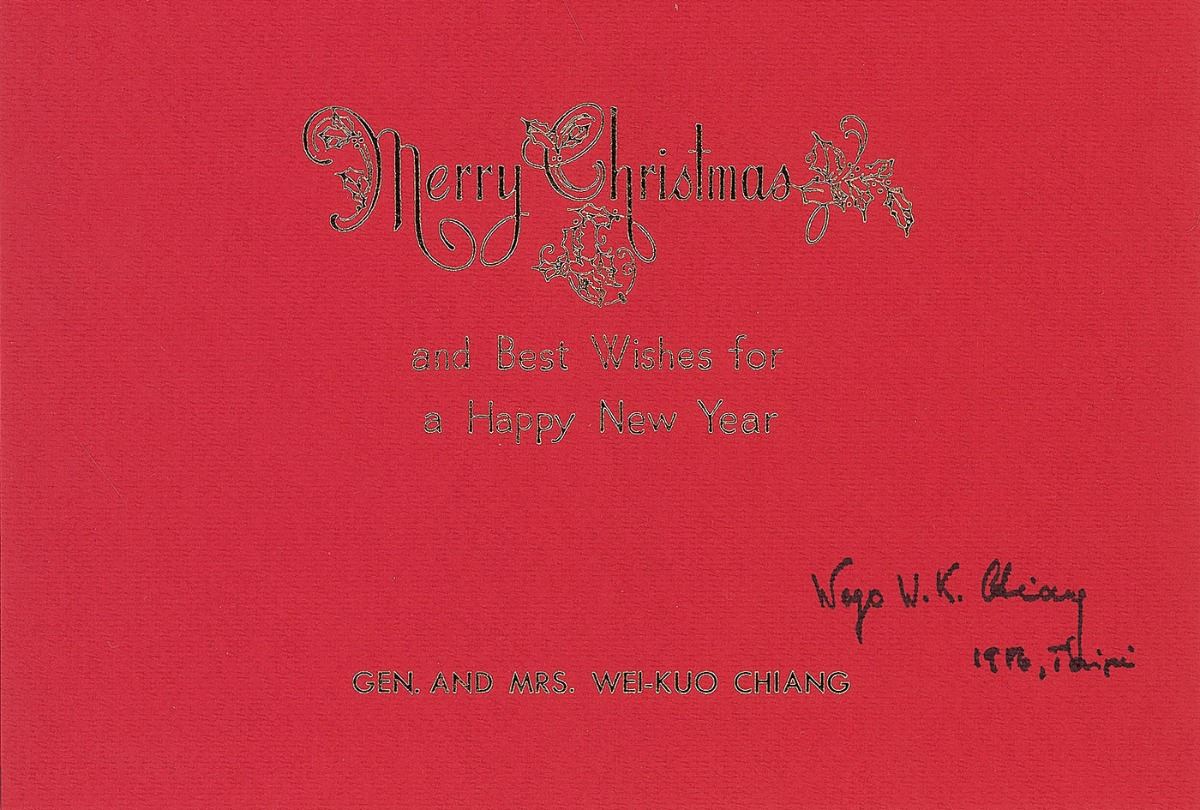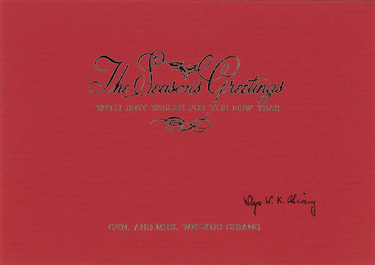 Military leader (1916–1997), and the adopted son of President Chiang Ching-kuo, whose military education in Germany and expertise with tank operations earned him a strong reputation in warfare strategy. Pair of festive red Christmas cards with embossed gold writing. Both are signed in black ink, one on the front, “Wego W. K. Chiang,” and the other on the inside, “Wego W. K. Chiang, 1986, Taipei.” In overall fine condition.