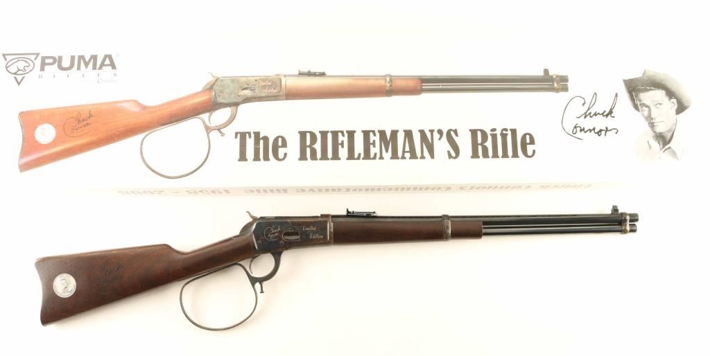 .44-40 Win SN: CC0361RR Large Loop lever action features 20" barrel, full length mag tube, carbine buttplate, saddle ring, blade front sight, elevator ladder type rear sight. Metal is finished with bluing on barrel & mag tube, case color on other metal parts. Loop has a faux screw attached (not functional) that gives the same appearance as the rifle used on the TV show "The Rifleman". Right side of receiver is engraved with Chuck Connors signature and "Limited Edition". Right side of stock is engraved with the same signature, and has an inlaid silver color coin with Chuck Connor's likeness, and "1958 - 2008 / CHUCK CONNORS COMMEMORATIVE". Overall condition is like new with few signs of handling. Original box included. Condition is NRA Excellent - like new *** Modern Firearm ***
