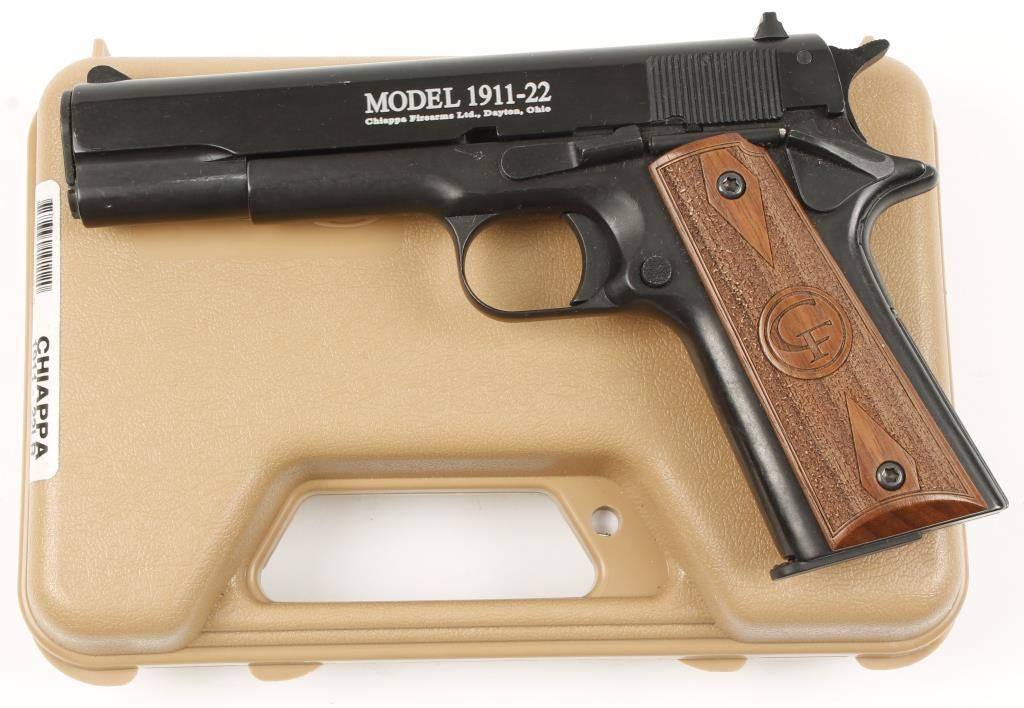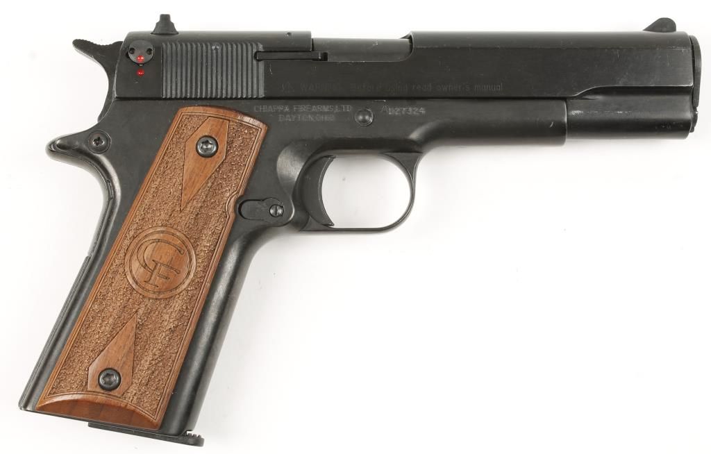 Single action 1911 style semi auto rimfire pistol with 5" barrel. Matte blue finish, walnut-like grips, alloy frame and fixed sights. Very good bore and action. Includes original box, manual and 1 magazine. Condition: Very good showing light use.