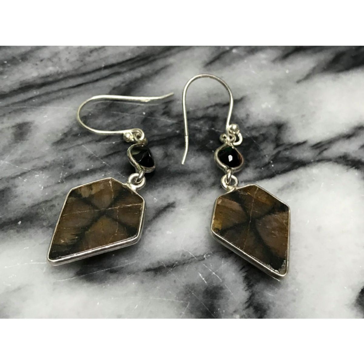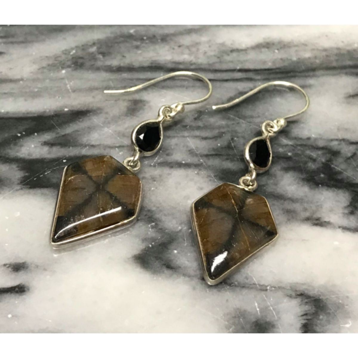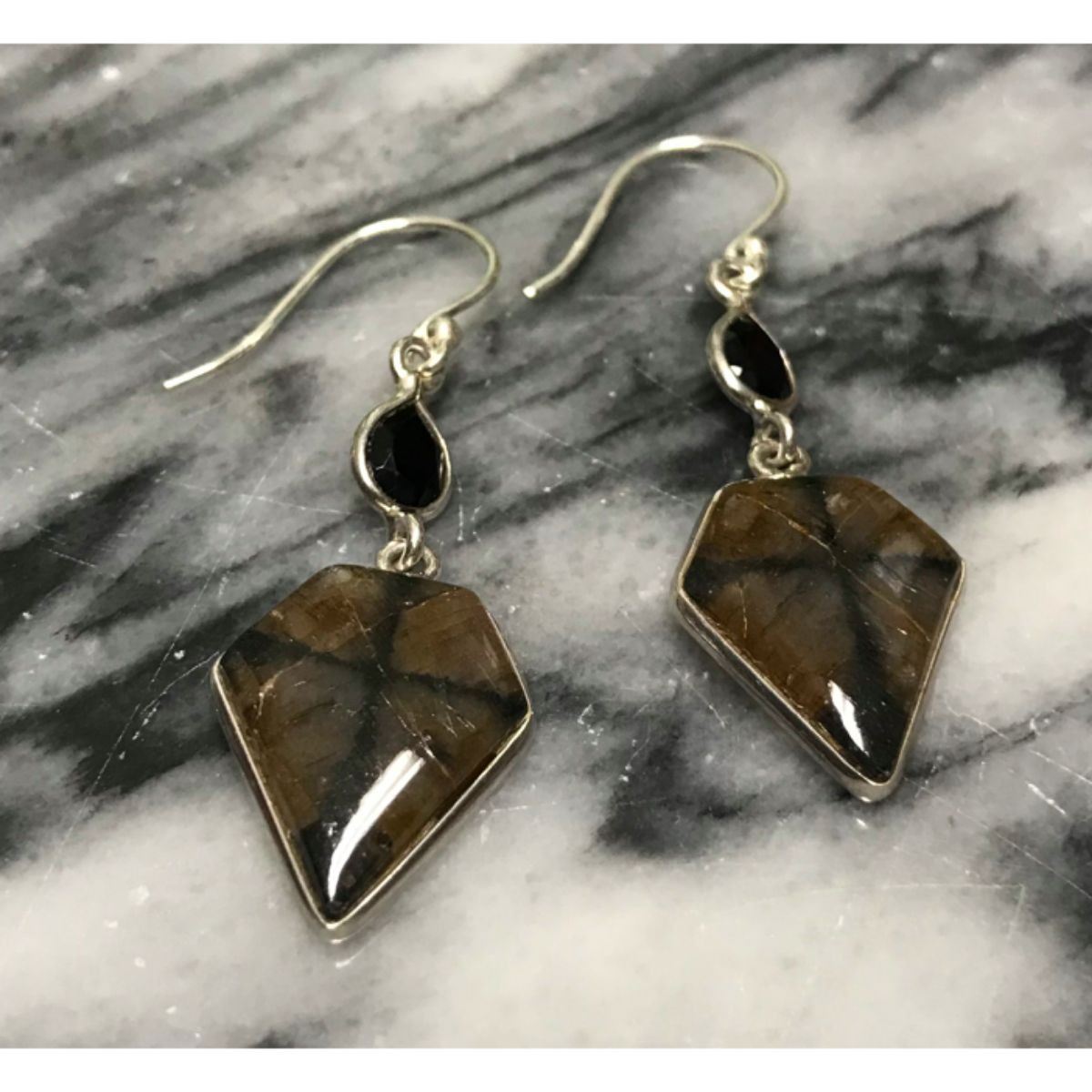 Chiastolite, ( cross stone ) with pear faceted black onyx gemstones set into sterling silver drop earrings. 2" L. 5.4 grams, gemstone & silver.