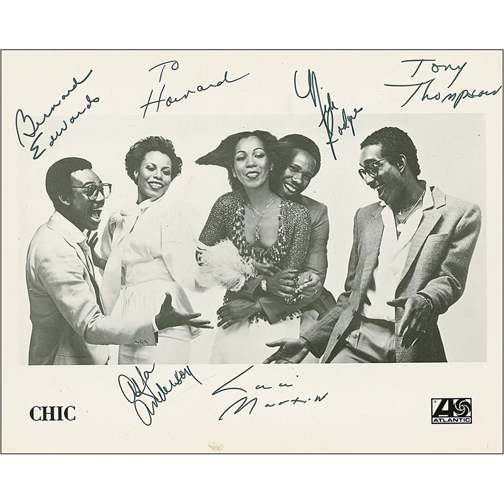 Glossy 10 x 8 cardstock Atlantic Records publicity photo of Chic, signed in black felt tip by Bernard Edwards, Alfa Anderson, Nile Rodgers, Luci Martin, and Tony Thompson, with one member adding the inscription, "To Howard." In fine condition, with a small stain near the bottom edge.