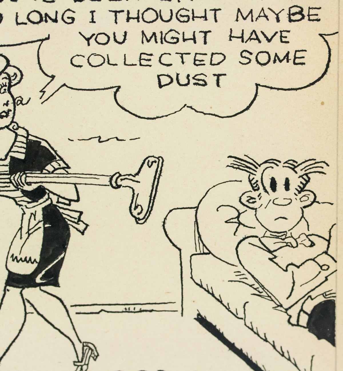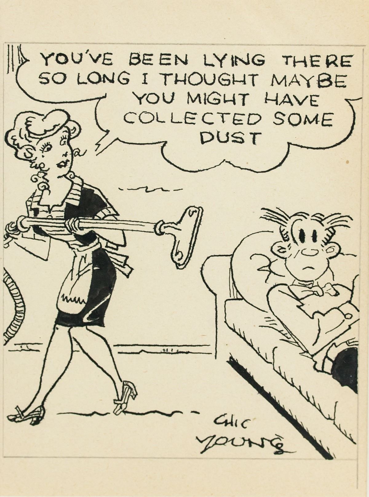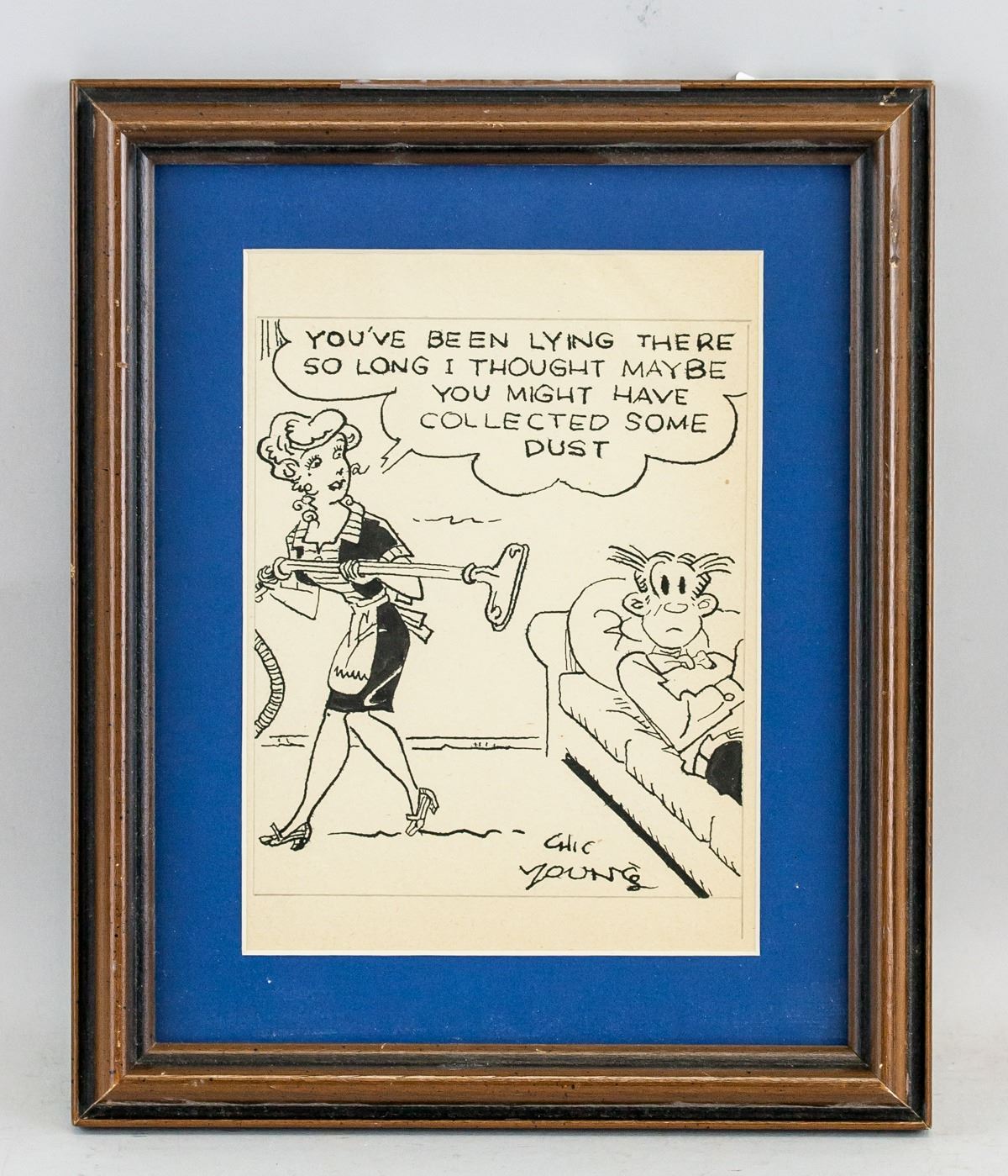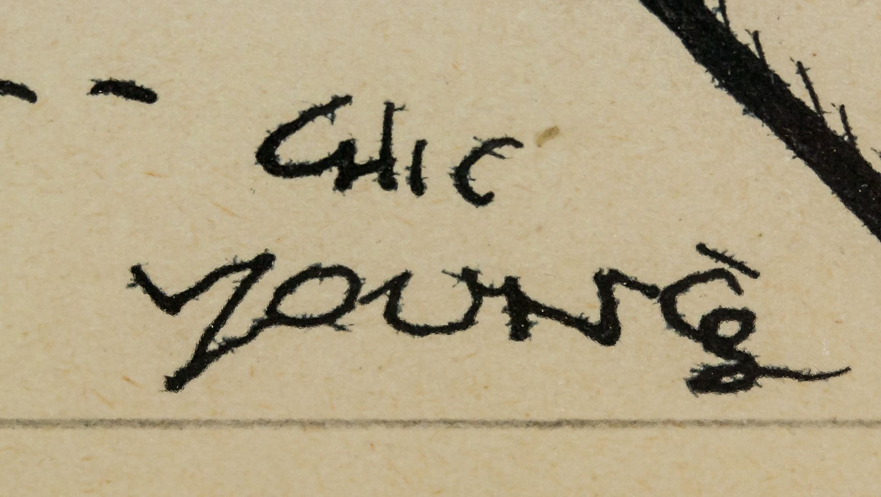 Ink on paper, framed. Featuring a comic sketch. Signed CHIC YOUNG on the lower right corner. Attributed to Chic Young (1901-1973, American). Verso dated 1930. 19.5 x 14 cm (7.7 x 5.5 inches). Frame size: 29 x 24 cm (11.4 x 9.4 inches). PROVENANCE: Southern Ontario estate