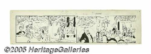 <B>Chic Young - Blondie Daily Comic Strip Original Art (King Features Syndicate, 1930).</B></I> Party girl, Blondie, takes the opportunity to interrupt Papa Bumstead's very important directors meeting to round up some dance partners, in this choice <I>Blondie</B></I> daily from the first few months of the strip's existence. Here's a rare opportunity to get an early Chic Young panel, featuring very early renditions of the most famous cartoon couple in history! The image area measures 18" x 4", and aside from some blue pencil editorial markings, and a very light stain in the final panel, the art is in Excellent condition.