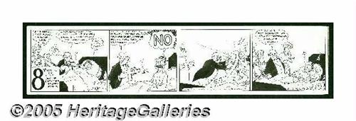 <B>Chic Young - Blondie Daily Comic Strip Original Art, dated 1-10-33 (King Features Syndicate, 1933).</B></I> On the eighth day of Dagwood's hunger strike, papa takes matters -- and a plateful of goodies -- in hand, in this charming early daily by <I>Blondie</B></I>'s creator, Chic Young. The hunger strike established <I>Blondie</B></I> as the one of the most enduring and popular strips in America. Blondie's carefree ways alienated Dagwood's blue-blood family, and Dagwood was forced to choose between his billion dollar inheritance and Blondie, and he chose the love of his life. The image area measures 18.5" x 4.25," and is in Excellent condition.