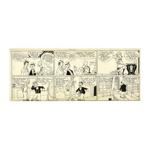 <B>Chic Young - Blondie Partial Sunday Comic Strip Original Art, undated (King Features Syndicate, circa 1931).</B></I> Blondie's first beau, Hiho Hennepin, looks like a shorter version of Dagwood Bumstead -- Blondie must like the clueless type! This lot is a partial Sunday, and it features the first two panel tiers of a four-tier strip. The two panel tiers have an image area of 17" x 6.75". Aside from the missing tiers, the art is in Excellent condition.