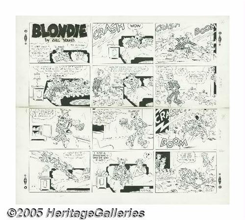 <B>Chic Young - Blondie Sunday Comic Strip Original Art, dated 3-9-52 (King Features Syndicate, 1952).</B></I> Dagwood and his sandwich -- that venerable American institution, is given a new twist when a thunderstorm assails the Bumstead home. Cameos by Blondie, Cookie, Alex, Daisy and her puppies lift this page into the classic category. The image area is 16.75" x 15". This Sunday has some very slight discoloration at the edges, and where the two panels were taped together. There are red editorial markings in each panel, but they do little to detract from the eye appeal of this Sunday; otherwise the strip is in Very Good condition.