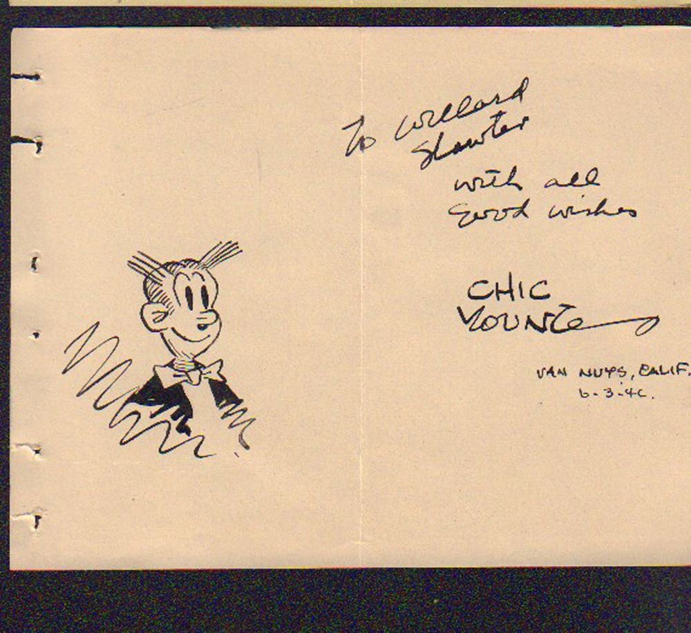 Autograph book page signed by Chic Young. It was inscribed to Willard Slawter, dated June 3, 1946 and includes a sketch of Dagwood. The page had been folded in half at some point. All items come with a certificate of authenticity good for the life of the piece.