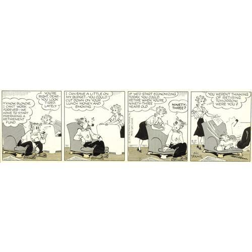 With proper planning, Dagwood could retire at age 93! This daily from April 17, 1956 has an image area measuring 17.5" x 4.75". Aside from some yellowing to the Zipatone, and light soiling, the condition is Very Good.<BR><BR><b>Shipping:</b> Framed (<a target="_blank" href="http://www.heritageauctions.com/common/shipping.php">view shipping information</a>)