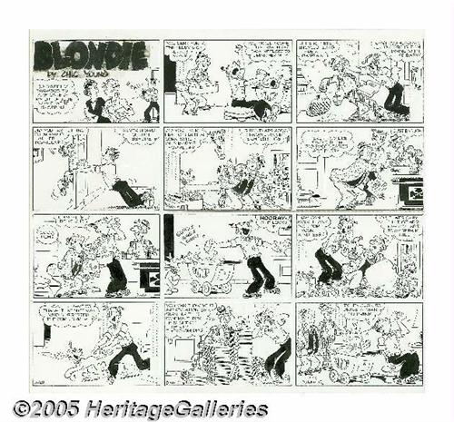 <B>Chic Young Studio - Blondie Sunday Comic Strip Original Art, dated 5-20-56 (King Features Syndicate, 1956).</B></I> Dagwood often falls for the pitches of door-to-door salesmen, and by the end of this episode, he has done so again. This strip has an image area of 17" x 15". The art was cut between panel tiers two and three, and the title logo is a recent replacement; otherwise the art is in Excellent condition. Add a celebrated example of pure Americana to your art collection!